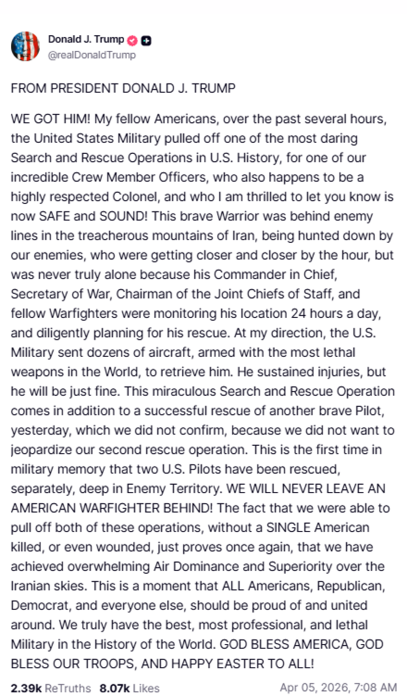 ΤΟΝ ΕΧΟΥΜΕ! Αγαπητοί μου Αμερικανοί, τις τελευταίες ώρες οι Ένοπλες Δυνάμεις των ΗΠΑ πραγματοποίησαν μία από τις πιο τολμηρές επιχειρήσεις έρευνας και διάσωσης στην ιστορία των ΗΠΑ, για έναν από τους εξαιρετικούς μας αξιωματικούς πληρώματος, ο οποίος είναι επίσης ένας ιδιαίτερα σεβαστός Συνταγματάρχης, και με χαρά σας ενημερώνω ότι είναι πλέον ΑΣΦΑΛΗΣ ΚΑΙ ΥΓΙΗΣ!