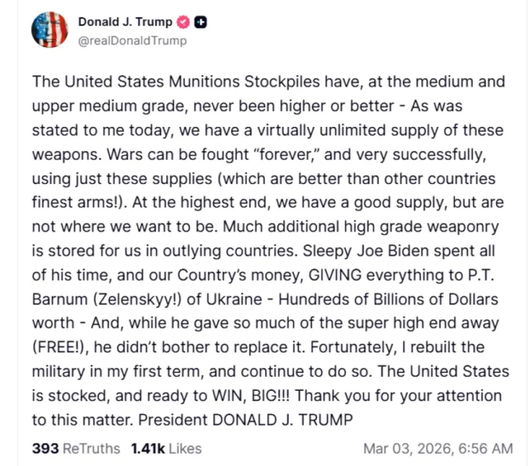Σύμφωνα με την ανάρτηση του προέδρου των ΗΠΑ «τα αποθέματα πολεμικού υλικού των Ηνωμένων Πολιτειών, σε μεσαίου και ανώτερου μεσαίου επιπέδου, δεν ήταν ποτέ υψηλότερα ή καλύτερα» με τον ίδιο να προσθέτει πώς «όπως μου αναφέρθηκε σήμερα, διαθέτουμε σχεδόν απεριόριστες προμήθειες αυτών των όπλων».