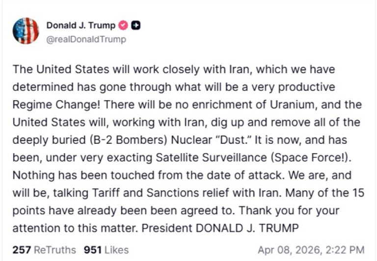 Ο Ντόναλντ Τραμπ ανέφερε σε ανάρτησή του ότι οι Ηνωμένες Πολιτείες σκοπεύουν να συνεργαστούν στενά με το Ιράν, υποστηρίζοντας ότι οι ΗΠΑ έχουν διαπιστώσει ότι η Τεχεράνη έχει περάσει από «μια αλλαγή καθεστώτος που θα αποδειχθεί εξαιρετικά παραγωγική».