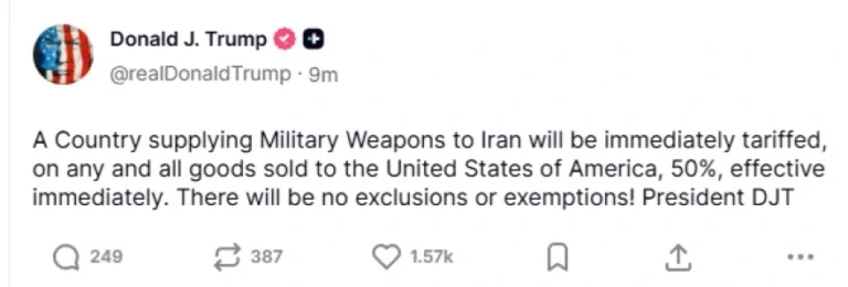 «Σε κάθε χώρα που προμηθεύει όπλα στο Ιράν θα επιβληθεί αμέσως δασμός 50% σε όλα τα εμπορεύματα που πωλούνται στις Ηνωμένες Πολιτείες, με άμεση ισχύ» πρόσθεσε σε άλλη ανάρτηση ο Αμερικανός πρόεδρος.