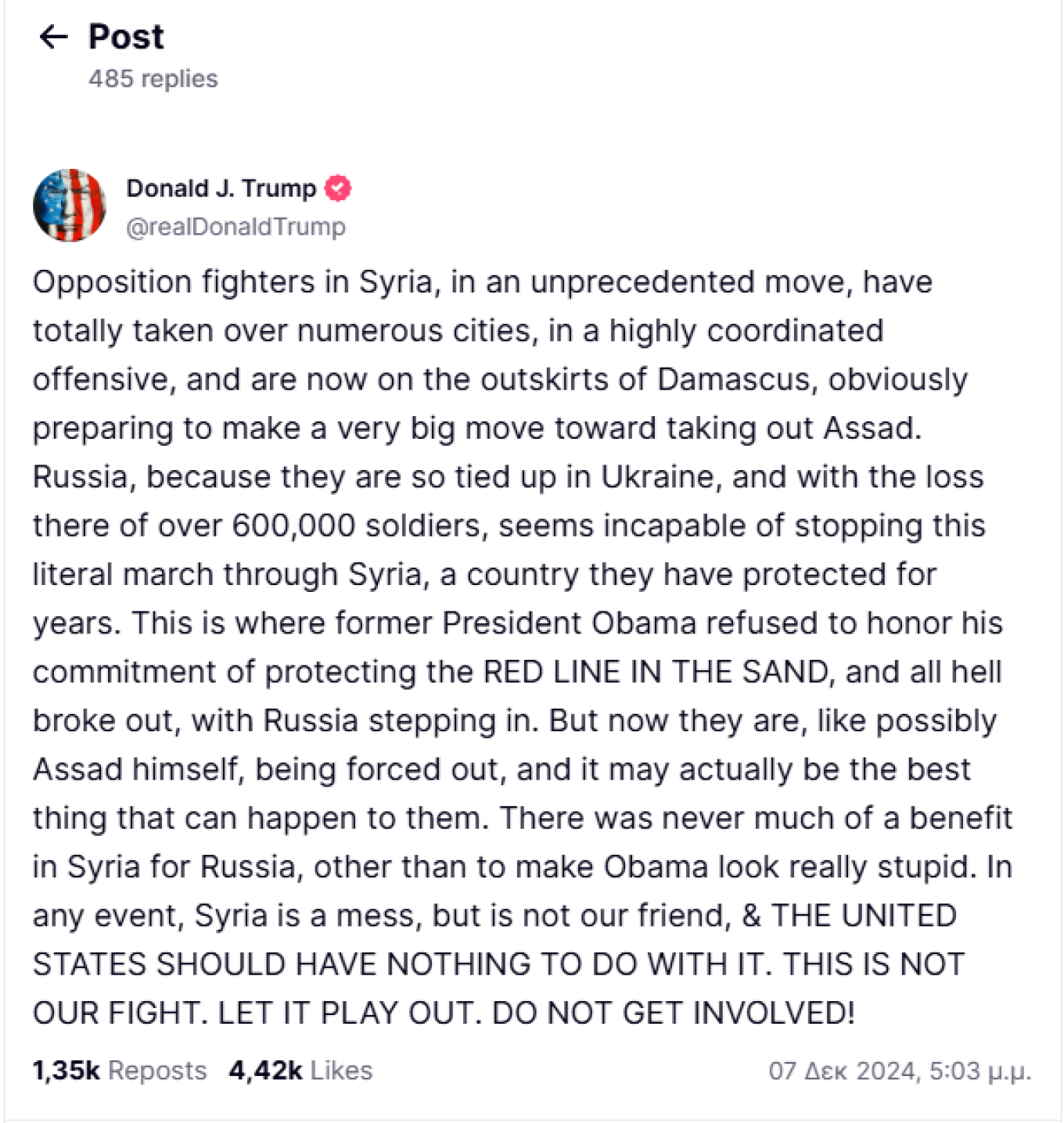 Μήνυμα στην κυβέρνηση Μπαίντεν να μην εμπλακεί στην κρίση της Συρίας στέλνει ο εκλεγμένος πρόεδρος Ντόναλντ Τραμπ με ανάρτησή του στο truthsocial.com.