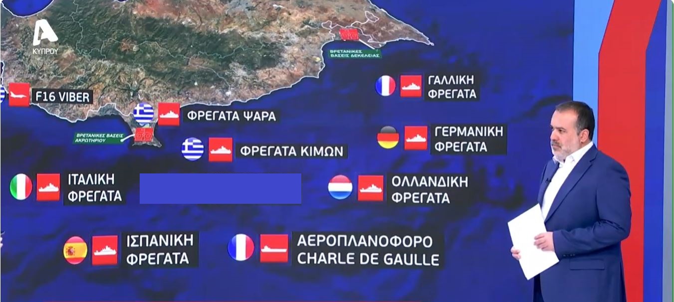 Καίρια πόστα στη θάλασσα και στη στεριά της Κύπρου έχουν καταλάβει οι αεροναυτικές δυνάμεις της Ελλάδας, της Γαλλίας, της Ιταλίας, της Ισπανίας και της Γερμανίας που ανταποκρίθηκαν στο αίτημα της Κυπριακής Δημοκρατίας για να ενισχύσουν την αμυντική θωράκιση του νησιού, υπό τις πολεμικές εξελίξεις στη Μέση Ανατολή και μετά την επίθεση με ιρανικό drone στις Βρετανικές Βάσεις Ακρωτηρίου.