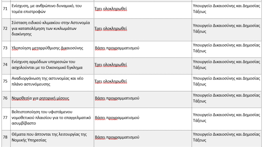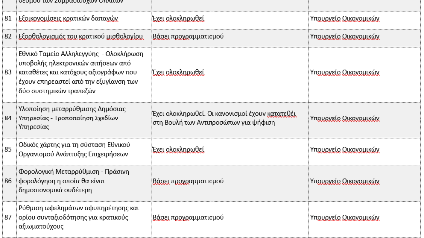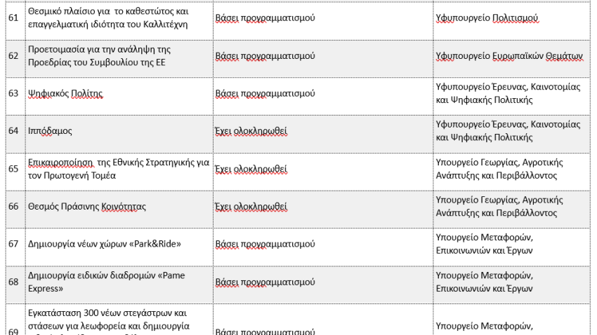 Από τα στοιχεία που τέθηκαν ενώπιον του Υπουργικού Συμβουλίου προκύπτει ότι 51 από τα έργα και δράσεις έχουν ολοκληρωθεί ή θα ολοκληρωθούν εντός των επόμενων εβδομάδων. Συγκεκριμένα, 38 από τα έργα/δράσεις έχουν, ήδη, ολοκληρωθεί και 13 αναμένεται να υλοποιηθούν στις επόμενες εβδομάδες.