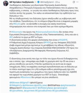 Τη λανθασμένη ενημέρωση των πολιτών από τον Υπουργό Ενέργειας Γιώργο Παπαναστασίου, αναφορικά με το ιδιοκτησιακό καθεστώς του έργου της ηλεκτρικής διασύνδεσης Ελλάδας – Κύπρου, κατήγγειλε δημόσια ο Πρόεδρος της Κοινοβουλευτικής Επιτροπής Ενέργειας, Κυριάκος Χατζηγιάννης. Τον κάλεσε «να αποκαταστήσει την ορθότητα των δηλώσεών του», διαφορετικά, όπως προειδοποίησε, θα ακολουθήσει «έκφραση μομφής στη Βουλή για συνεχή και κακής ποιότητας πληροφόρηση στον κυπριακό λαό».