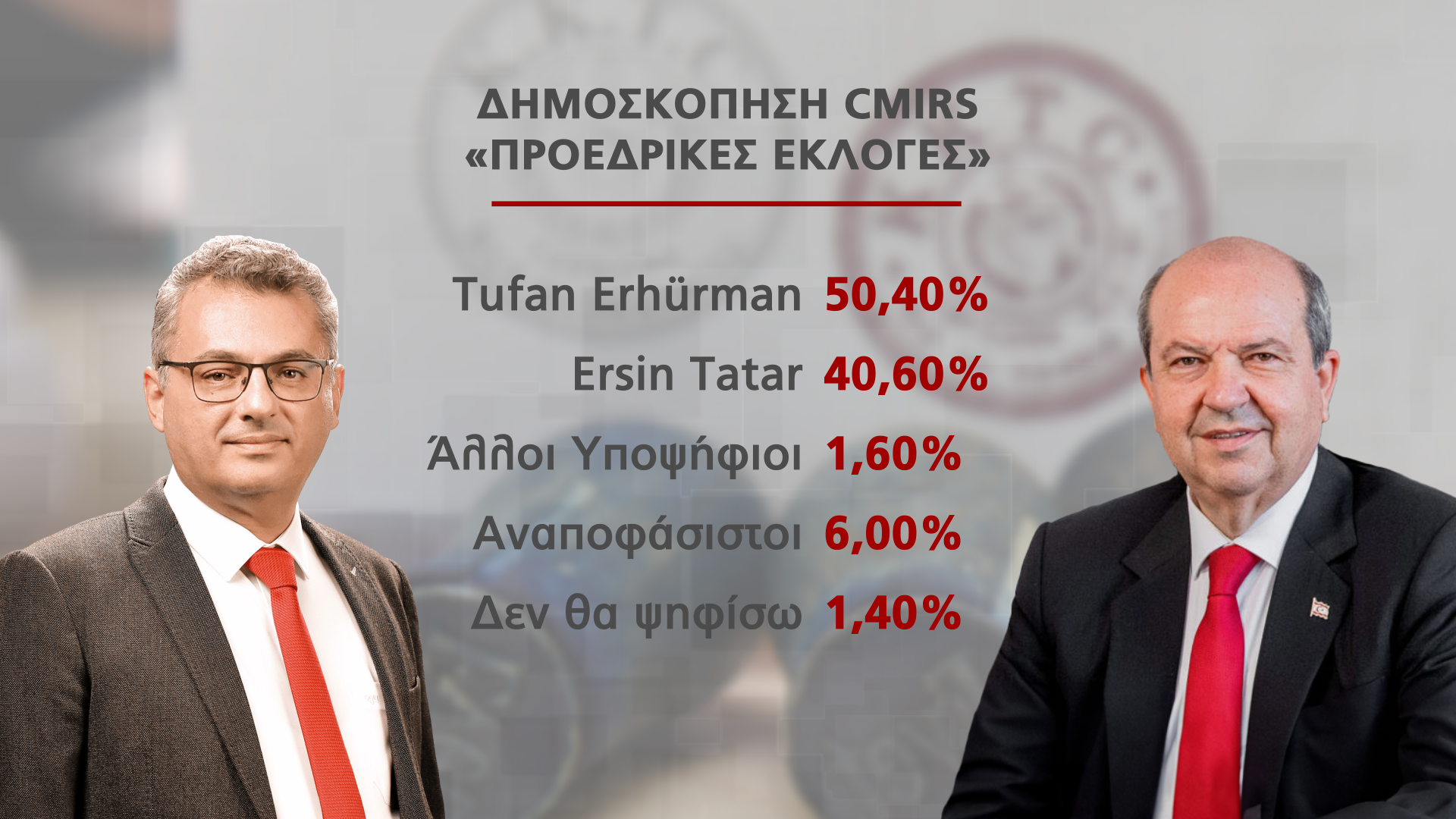 Ως το ακλόνητο φαβορί της «προεδρικής» κούρσας της 19ης Οκτωβρίου στα κατεχόμενα χρίζει τον Πρόεδρο του Ρεπουμπλικανικού Τουρκικού Κόμματος (ΡΤΚ) Τουφάν Ερχιουρμάν, η νέα τριμηνιαία έρευνα κοινής γνώμης του Κέντρου Μελετών Μετανάστευσης, Ταυτότητας και Δικαιωμάτων (CMIRS).