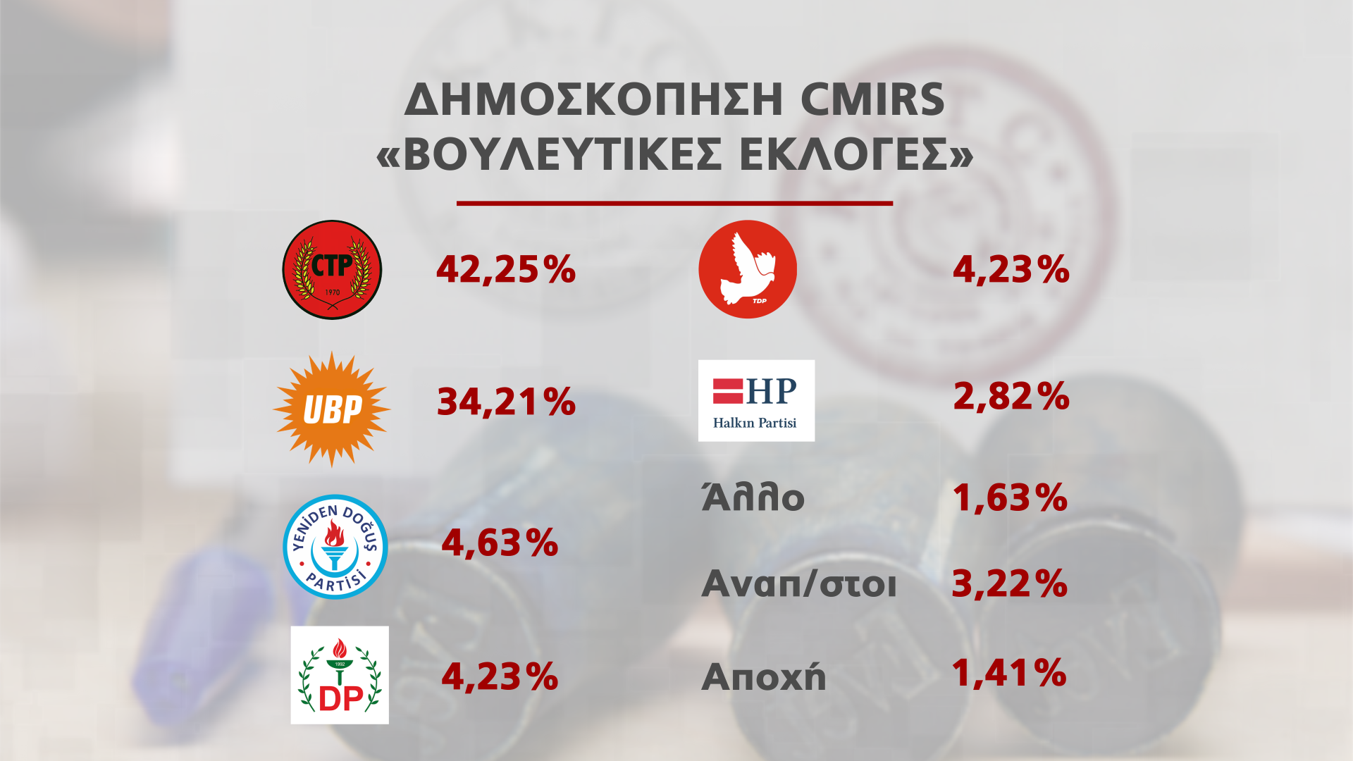 Την ίδια ώρα, σύμφωνα με τα ευρήματα της έρευνας, εάν στα κατεχόμενα διεξάγονταν σήμερα γενικές «εκλογές», το ΡΤΚ θα επιτύγχανε τον σχηματισμό «αυτοδύναμης κυβέρνησης» καθώς θα εξασφάλιζε το 42,25% των ψήφων, έναντι του 31,91% που έλαβε στις «βουλευτικές» του 2022. Την ίδια ώρα, το δεξιό Κόμμα Εθνικής Ενότητας (UBP) του Ερσίν Τατάρ θα άγγιζε το 34,21%, το Κόμμα της Αναγέννησης (YDP) 4,63%, ενώ το Δημοκρατικό Κόμμα (DP) και το Κόμμα Κοινοτικής Δημοκρατίας (TDP) θα λάμβαναν από 4,23%. Σε ένα τέτοιο ενδεχόμενο, χωρίς να κατανεμηθούν οι αναποφάσιστοι ψηφοφόροι, είσοδο της ψευδοβουλή, θα επιτύγχαναν μόνο τα δυο μεγάλα κόμματα, καθώς οι υπόλοιποι μικρότεροι σχηματισμοί δεν θα ξεπερνούσαν το εκλογικό μέτρο του 5%.