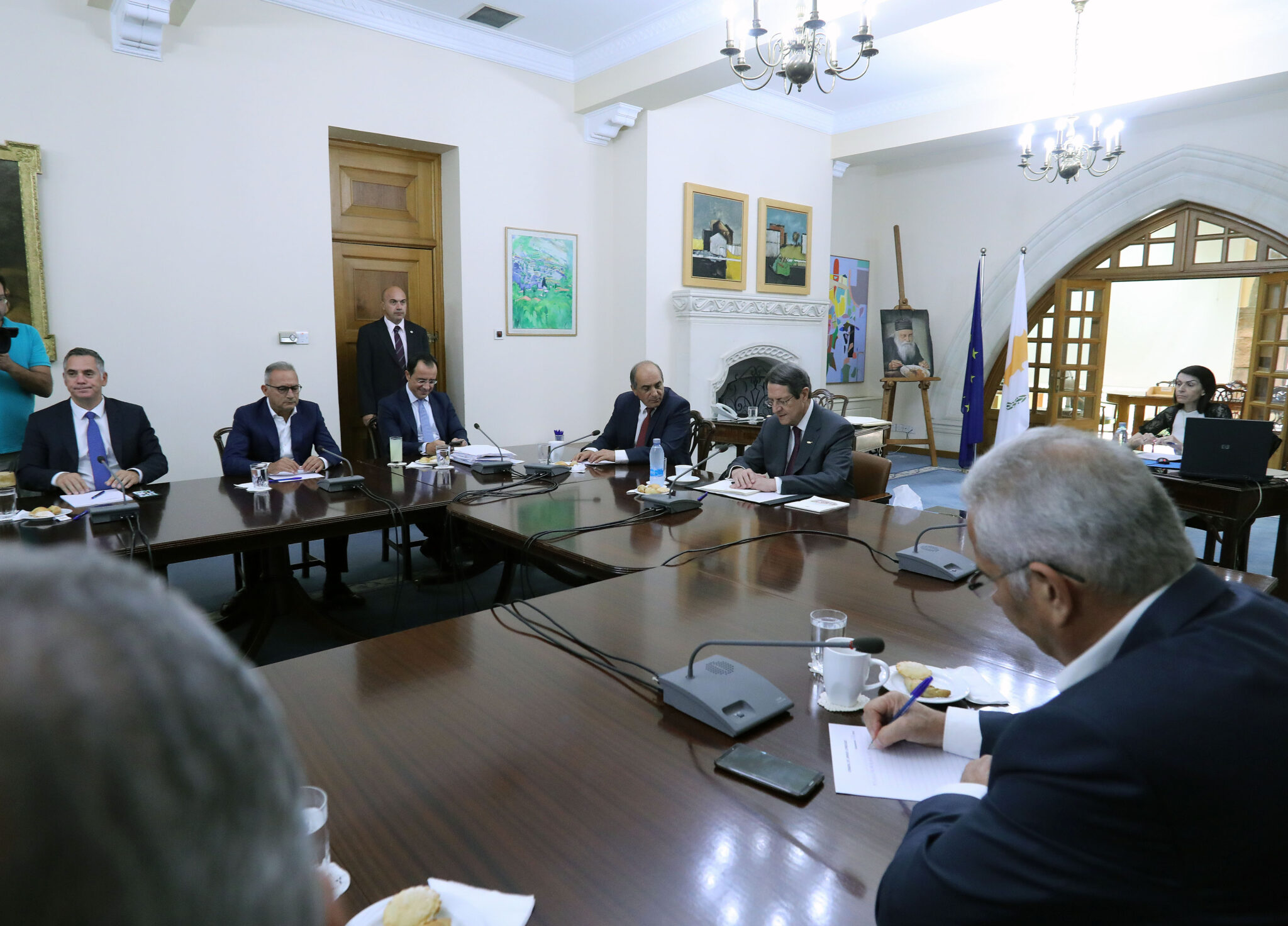 Στο Προεδρικό βρίσκονται επίσης από κυβερνητικής πλευράς ο Υπουργός Εξωτερικών Νίκος Χριστοδουλίδης, ο Κυβερνητικός Εκπρόσωπος Πρόδρομος Προδρόμου και ο Διαπραγματευτής της Ελληνοκυπριακής πλευράς Ανδρέας Μαυρογιάννης.