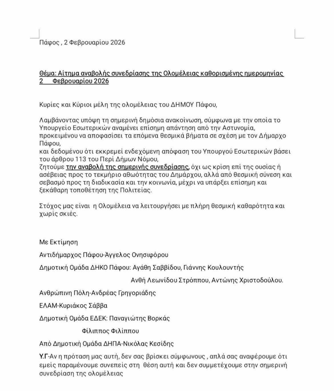 ΦΩΤΟ: Ιδού η επιστολή διαμαρτυρίας των Δημοτικών Συμβούλων Πάφου, αναβλήθηκε η συνεδρίαση