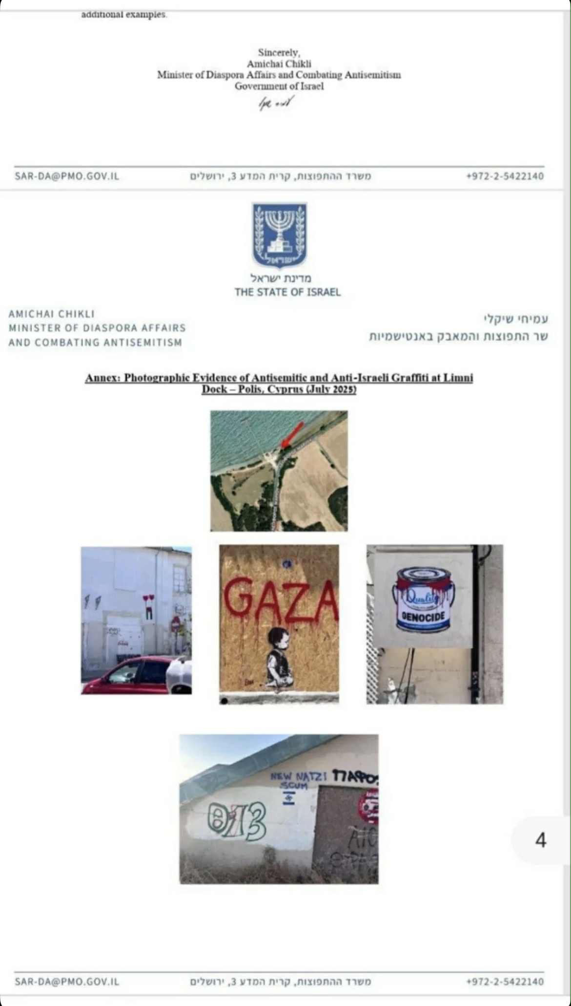 «Φωτιές» άναψε η εγκύκλιος του Υπουργείου Εσωτερικών με οδηγίες του Υπουργού Διασποράς του Ισραήλ για σβήσιμο συνθημάτων στους τοίχους στην Κύπρο, που αφορούν στη Γάζα και το Ισραήλ. Μάλιστα στην επιστολή υπήρχε επισύναψη συγκεκριμένων γκράφιτι.