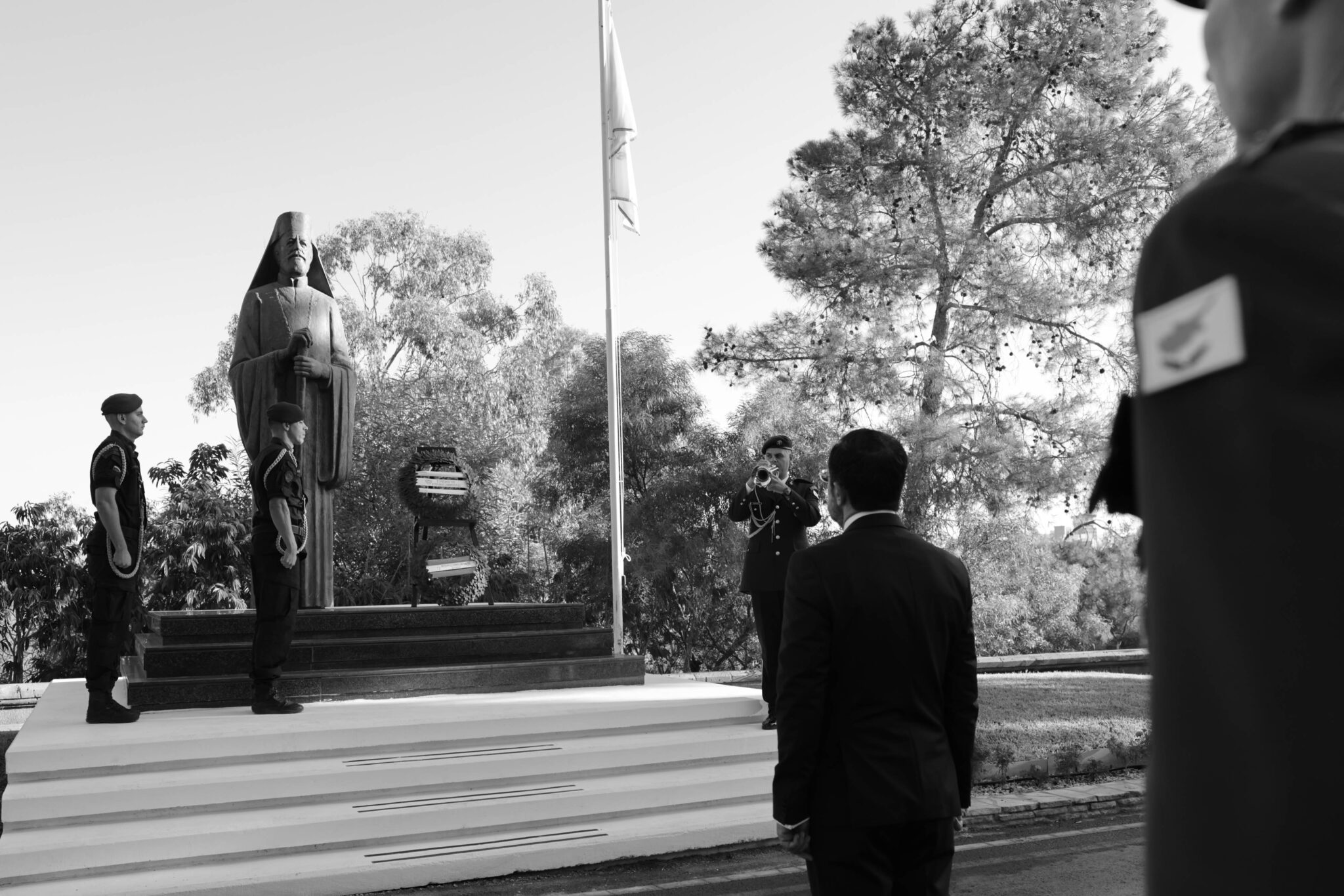 Στη συνέχεια ο Πρόεδρος Χριστοδουλίδης μετέβη στο Προεδρικό Μέγαρο, όπου κατέθεσε στεφάνι στον ανδριάντα του Εθνάρχη Μακαρίου Γ’, στον προαύλιο χώρο του Μεγάρου.