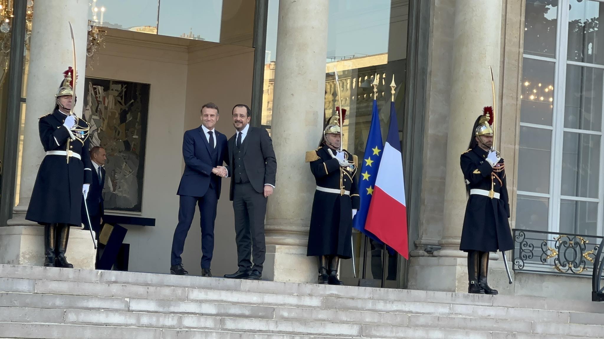 Ο ΠτΔ έφτασε γύρω στις 11.00 ώρα Κύπρου στο Μέγαρο των Ηλυσίων στο Παρίσι, όπου και τον υποδέχθηκε θερμά ο Εμανουέλ Μακρόν, με τον οποίο αναμένεται να υπογράψει Συμφωνία Στρατηγικής Εταιρικής Σχέσης, με αιχμή την άμυνα, την οικονομία και τον ευρωπαϊκό συντονισμό.