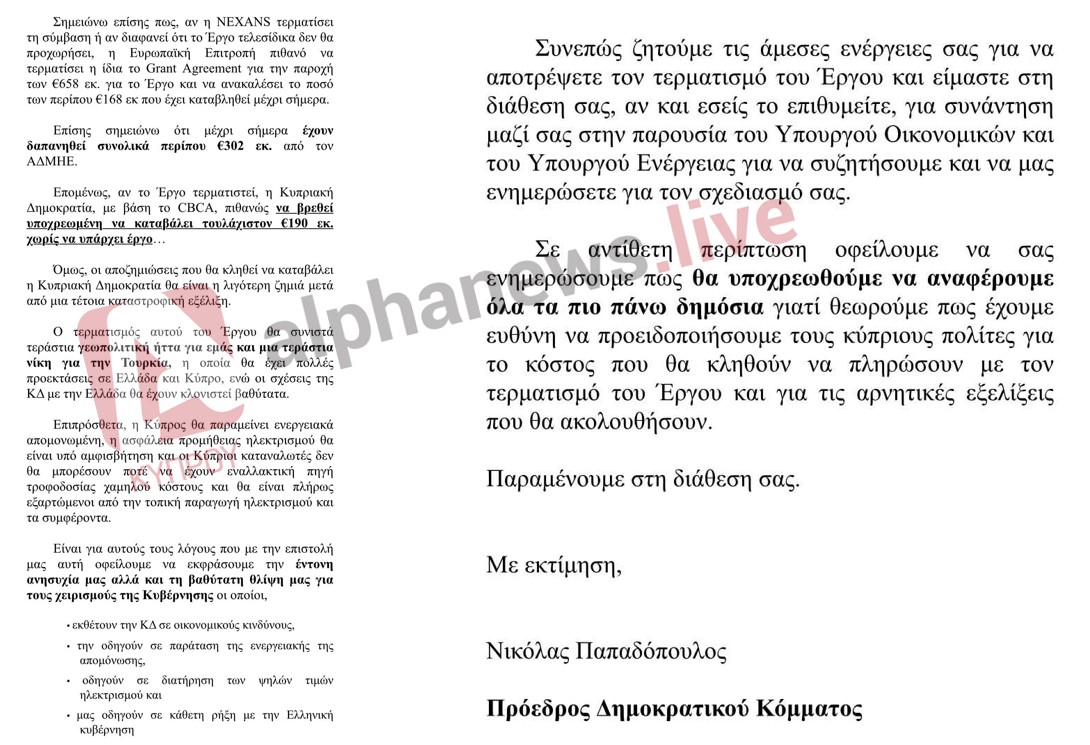 Αφορμή υπήρξε η επιστολή που απέστειλε στις 10 Δεκεμβρίου ο Πρόεδρος του ΔΗΚΟ Νικόλας Παπαδόπουλος προς τον Πρόεδρο της Δημοκρατίας Νίκο Χριστοδουλίδη που έχει στην διάθεσή της το «alphanewslive», με την οποία ο Νικόλας Παπαδόπουλος υπογραμμίζοντας πως θεωρεί το έργο υψίστης εθνικής και γεωπολιτικής σημασίας, εκφράζει την ανησυχία του από το γεγονός ότι πληροφορίες θέλουν την NEXANS να προχωρά σε μονομερή τερματισμό των συμβολαίων της με υπεργολάβους της που σχετίζονται με προμήθεια υλικών και υπηρεσιών για το έργο. Ο Πρόεδρος του ΔΗΚΟ Νικόλας Παπαδόπουλος ζήτησε από τον Πρόεδρο της Δημοκρατίας συνάντηση με τους υπουργούς Οικονομικών και Ενέργειας κάτι το οποίο δεν έχει ακόμη διευθετηθεί και υπήρξε όπως φαίνεται ο κύριος λόγος της έντονης κριτικής που δέχεται η κυβέρνηση δημοσίως από το ΔΗΚΟ. Αξίζει να σημειωθεί πως στην επιστολή ο Νικόλας Παπαδόπουλος είναι έντονα επικριτικός προς την κυβέρνηση σημειώνοντας πως οι κυβερνητικοί χειρισμοί: