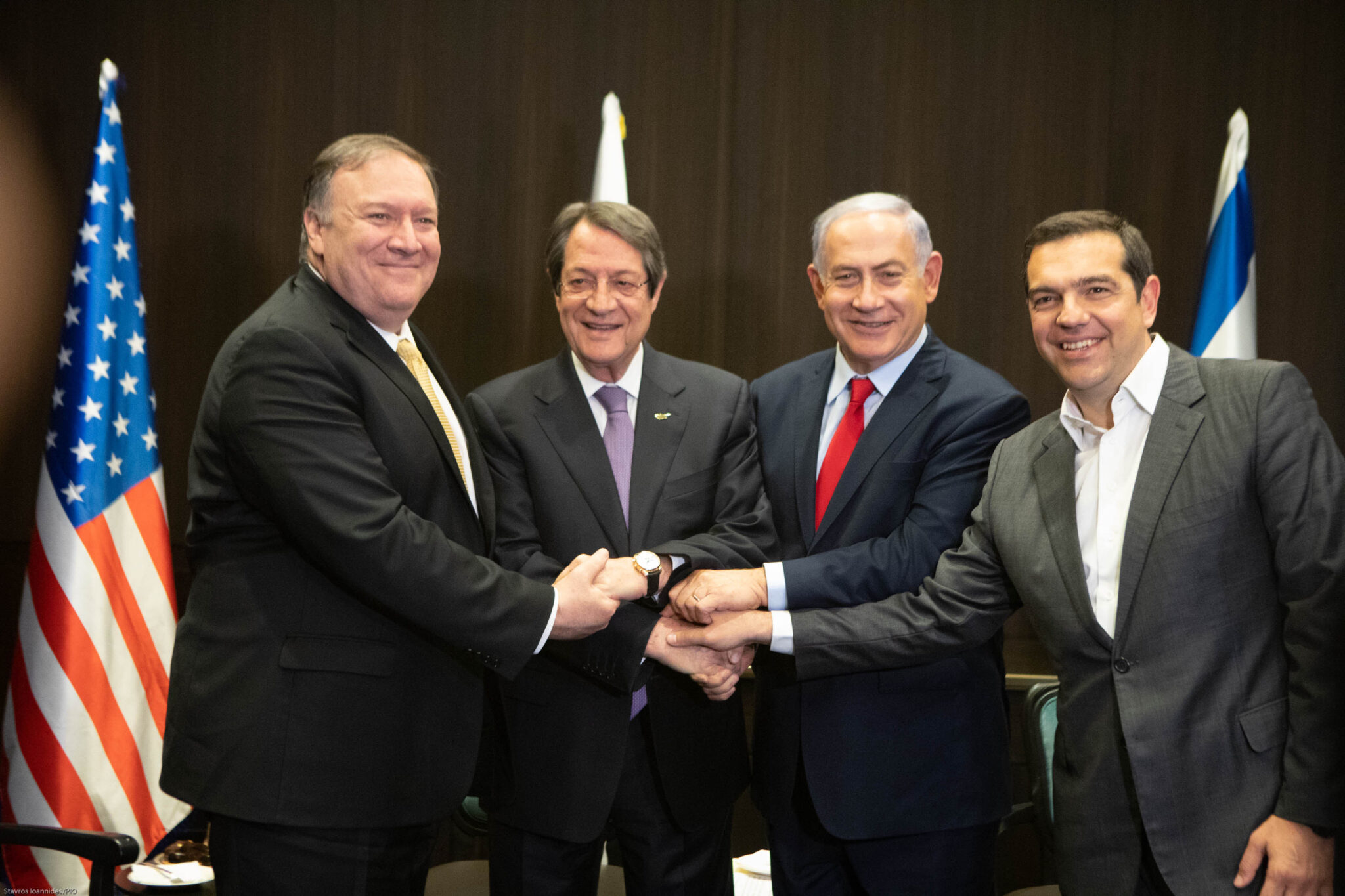 «Οι Κυβερνήσεις των Ηνωμένων Πολιτειών, του κράτους του Ισραήλ, της Ελληνικής Δημοκρατίας και της Κυπριακής Δημοκρατίας συναντήθηκαν σήμερα στην Ιερουσαλήμ για να διαβεβαιώσουν την κοινή τους δέσμευση να προωθήσουν την ειρήνη, τη σταθερότητα, την ασφάλεια και την ευημερία στην περιοχή της Ανατολικής Μεσογείου. Ο Υπουργός Εξωτερικών Πομπέο υπογράμμισε ότι οι ΗΠΑ στηρίζουν τον τριμερή μηχανισμό που δημιούργησε το Ισραήλ, η Ελλάδα και η Κύπρος, σημειώνοντας τη σημασία της αυξανόμενης συνεργασίας. Οι ηγέτες συμφώνησαν να αυξήσουν την περιφερειακή συνεργασία, να στηρίξουν την ενεργειακή ανεξαρτησία και ασφάλεια, και να αμυνθούν ενάντια σε εξωτερικές κακές επιρροές στην Ανατολική Μεσόγειο και την ευρύτερη Μέση Ανατολή. Χαιρέτισαν τις πρόσφατες ανακαλύψεις φυσικού αερίου στην Ανατολική Μεσόγειο και τις προοπτικές τους στη συμβολή στην ενεργειακή ασφάλεια και τις εναλλακτικές πηγές.»