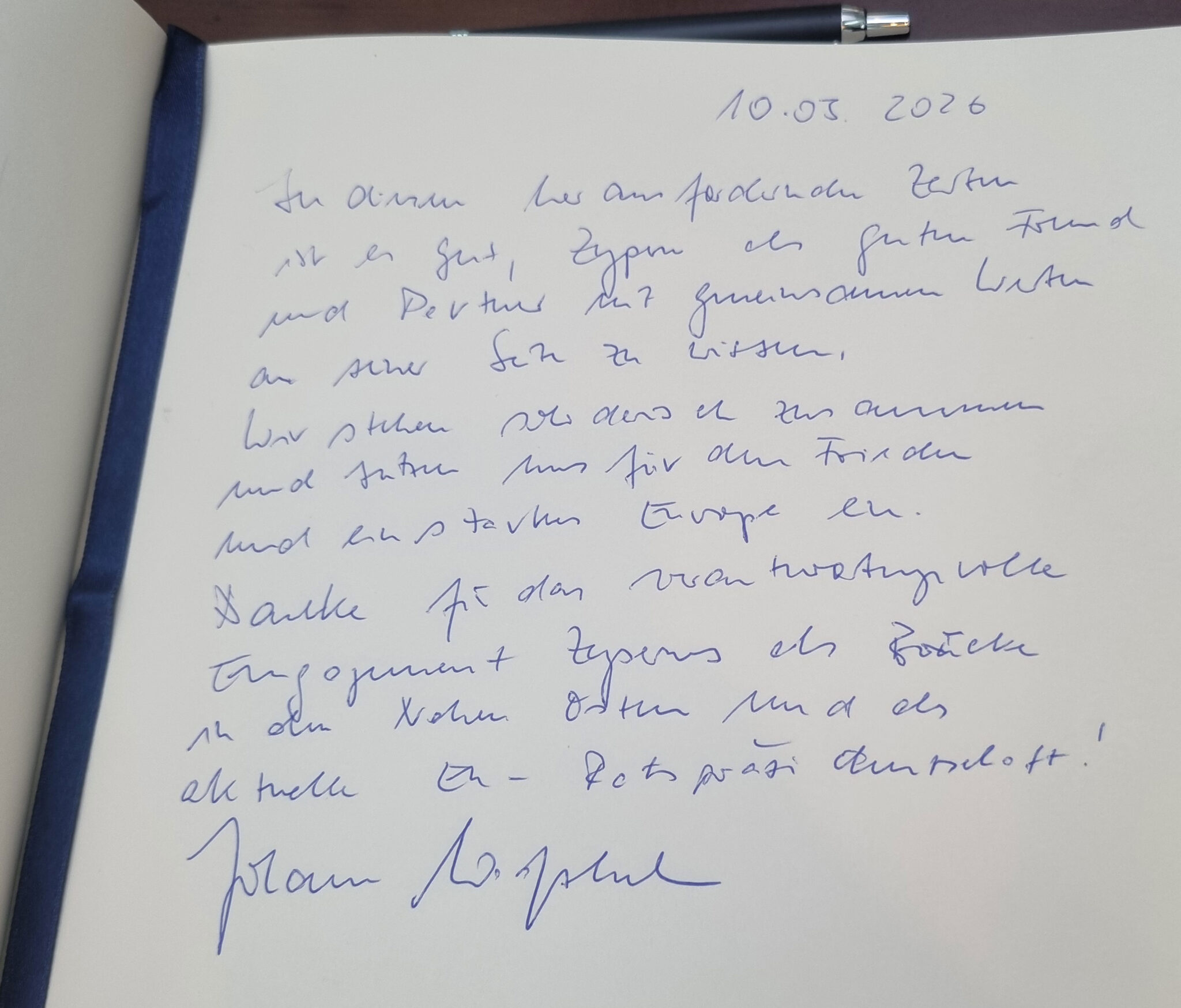 Τον Υπουργό Εξωτερικών της Γερμανίας Johann Wadephul καλωσόρισε την Τρίτη στο Υπουργείο Εξωτερικών, ο Υπουργός Εξωτερικών Κωνσταντίνος Κόμπος, με τον Γερμανό ομόλογό του να υπογράφει στο βιβλίο επισκεπτών ότι «αυτές τις δύσκολες εποχές είναι καλό να έχεις την Κύπρο σαν καλό φίλο και εταίρο με ίδιες αξίες».
