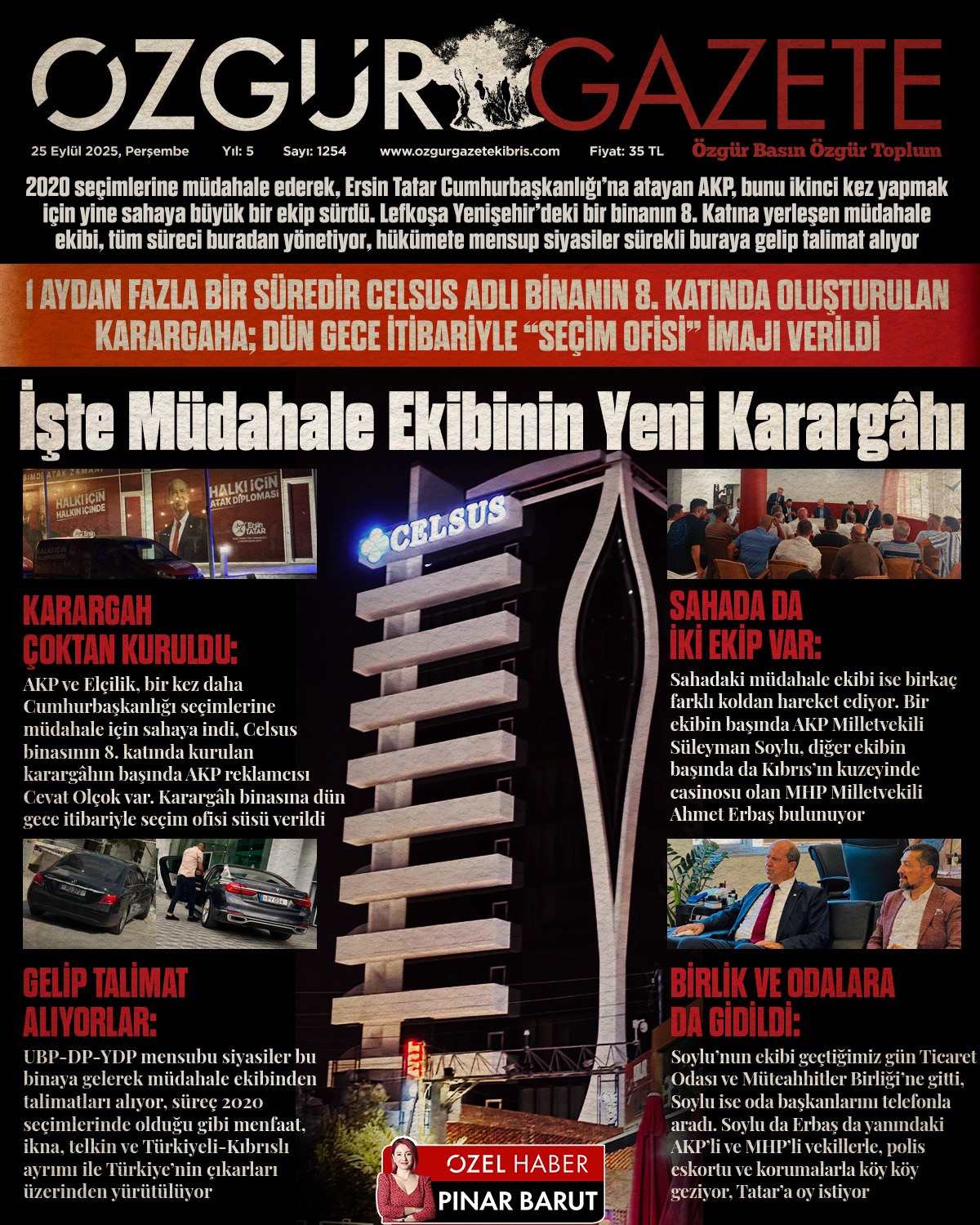 Σύμφωνα με πρωτοσέλιδο δημοσίευμα της εφημερίδας Ozgur (25/09/25) στη Λευκωσία λειτουργεί εδώ και βδομάδες το αρχηγείο της «ομάδας παρέμβασης» η οποία «οργώνει» από χωριό σε χωριό τα κατεχόμενα, καλώντας σε στήριξη της υποψηφιότητας Τατάρ.