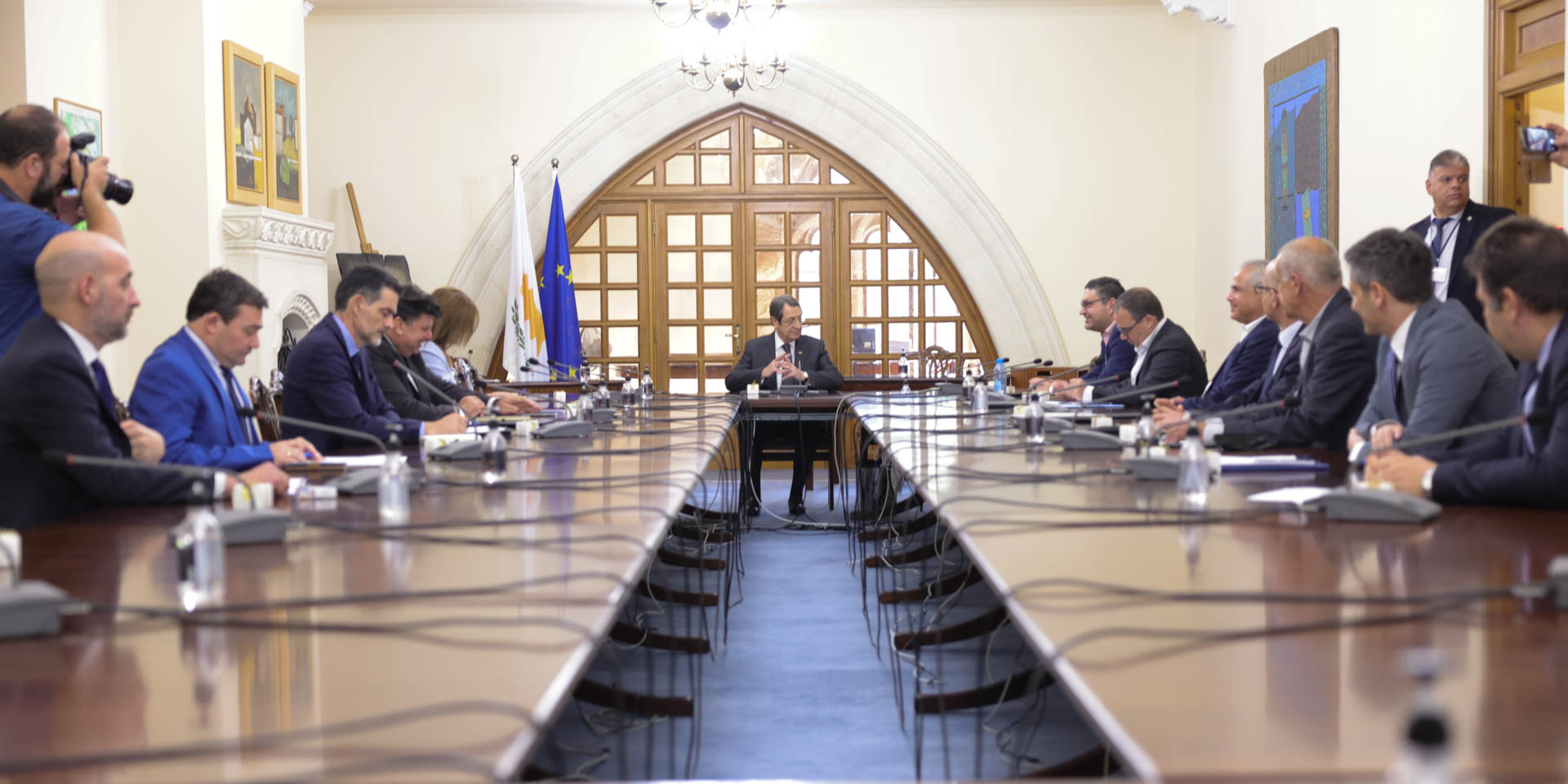 “Στη σύσκεψη συμμετείχαν ο Υπουργός Οικονομικών κ. Κωνσταντίνος Πετρίδης, η Υπουργός Ενέργειας, Εμπορίου και Βιομηχανίας κα. Νατάσα Πηλείδου, ο Υφυπουργός παρά τω Προέδρω κ. Πέτρος Δημητρίου και υπηρεσιακοί παράγοντες.