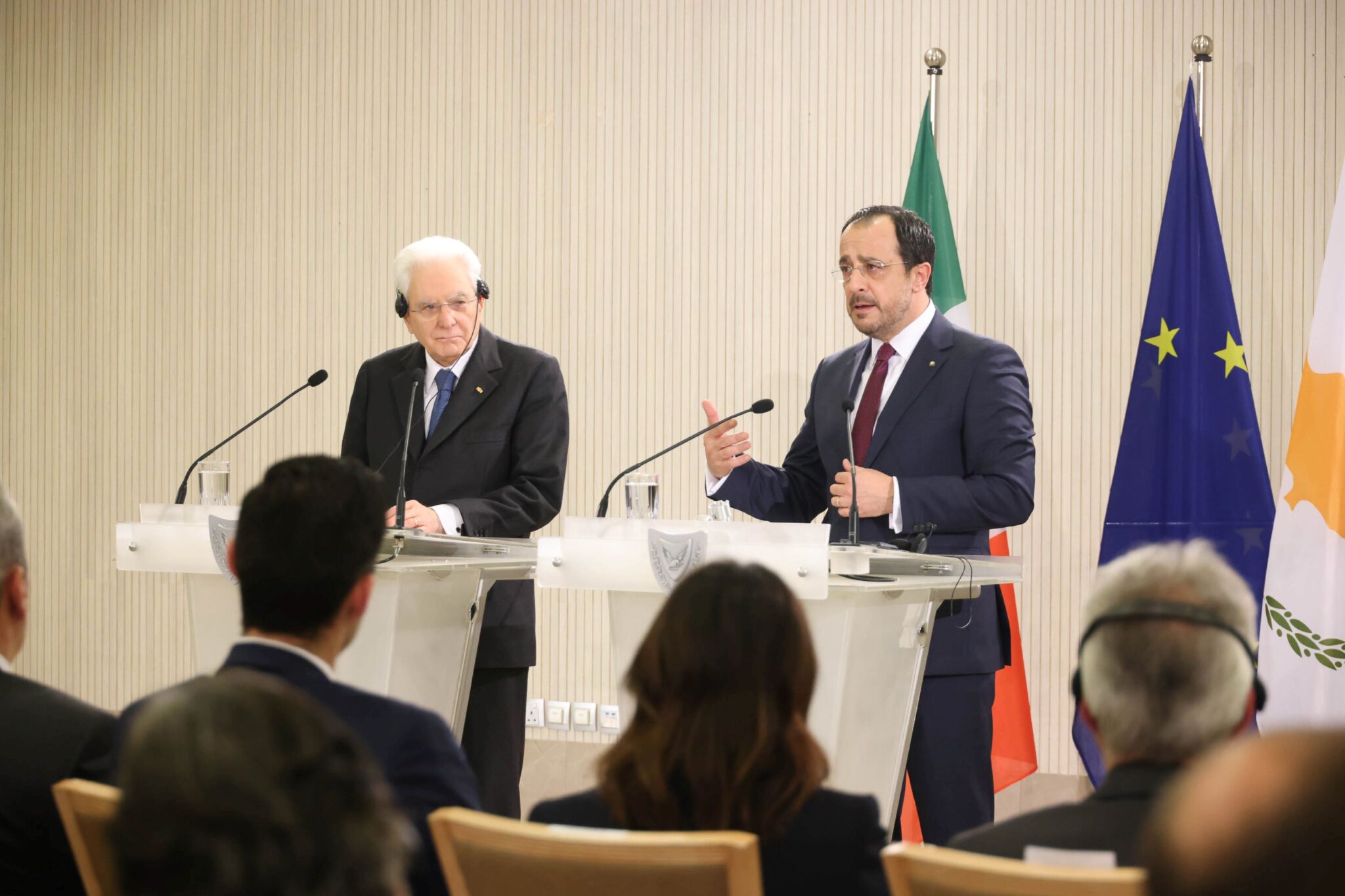 Ο Ιταλός Πρόεδρος σε δηλώσεις στο Προεδρικό μετά την κατ’ ιδίαν συνάντησή του με τον Πρόεδρο Χριστοδουλίδη, είπε πως η λύση του Κυπριακού είναι θεμελιώδους σημασίας για την ισορροπία στην Μεσόγειο, ενώ τόνισε τη στήριξη της χώρας του σε λύση Διζωνικής Δικοινοτικής Ομοσπονδίας σύμφωνης με τα ψηφίσματα των ΗΕ. Χαιρέτισε, επίσης, την κάθοδο της προσωπικής απεσταλμένης του Γενικού Γραμματέα των ΗΕ, που έχει, όπως είπε, δύσκολο έργο μπροστά της.
