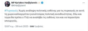 Με ανάρτηση στην πλατφόρμα Χ, τονίζει ότι «χωρίς ανάληψη πολιτικής ευθύνης για τις πυρκαγιές σε αυτή τη χώρα καλλιεργείται η κουλτούρας πολιτική ανευθυνότητας.»