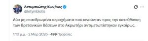 Νέα επίθεση με δύο μη επανδρωμένα αεροσκάφη δέχτηκαν οι Βρετανικές Βάσεις Ακρωτηρίου, σημαίνοντας συναγερμό στις γύρω κοινότητες. Οι Αρχές έδωσαν οδηγίες τόσο για εκκένωση χωριών στην επαρχία Λεμεσού, όσο και χωριών στην επαρχία Πάφου που βρίσκονται πέριξ του αεροδρομίου της πόλης.
