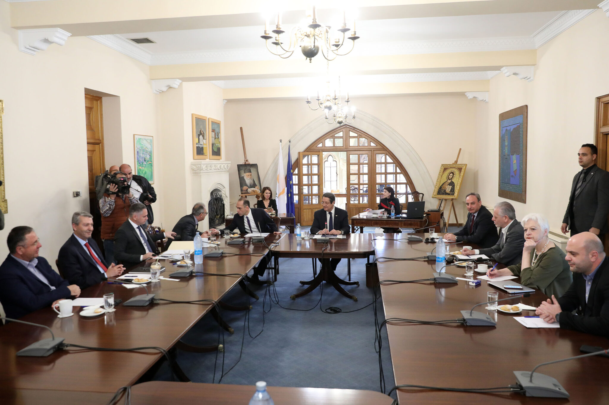 Νέα σύσκεψη των Αρχηγών και Εκπροσώπων των Κοινοβουλευτικών κομμάτων στην παρουσία του Γενικού Εισαγγελέα αποφασίστηκε κατά τη σημερινή δίωρη σύσκεψη στο Προεδρικό Μέγαρο αναφορικά με τους σχεδιασμούς της Κυβέρνησης για την απόφαση του Διοικητικού Δικαστηρίου σε σχέση με τις αποκοπές μισθών και συντάξεων στο Δημόσιο.
