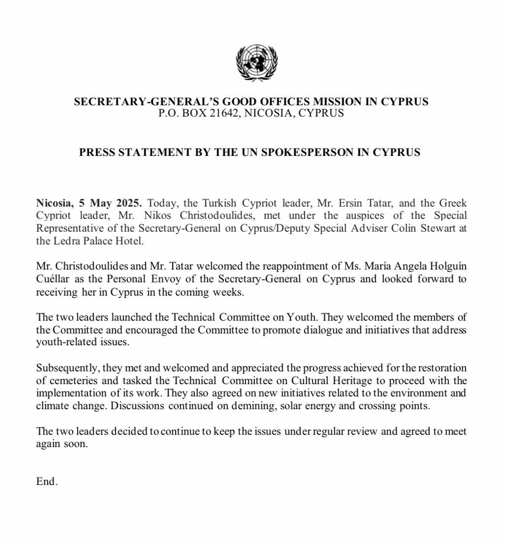 Τον διορισμό της Μαρία Άνχελα Ολγκίν ως Προσωπική Απεσταλμένη του Γενικού Γραμματέα του ΟΗΕ για το Κυπριακό χαιρετίζουν ο Πρόεδρος της Δημοκρατίας Νίκος Χριστοδουλίδης και ο τουρκοκύπριος ηγέτης Ερσίν Τατάρ στο κοινό ανακοινωθέν που εξέδωσαν ο Εκπρόσωπος Τύπου της ΟΥΝΦΙΚΥΠ μετά τη νέα συνάντηση των δύο ηγετών.