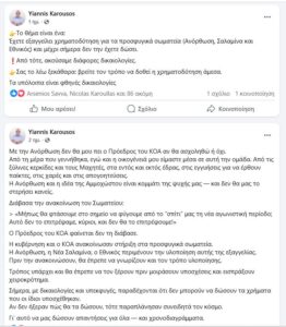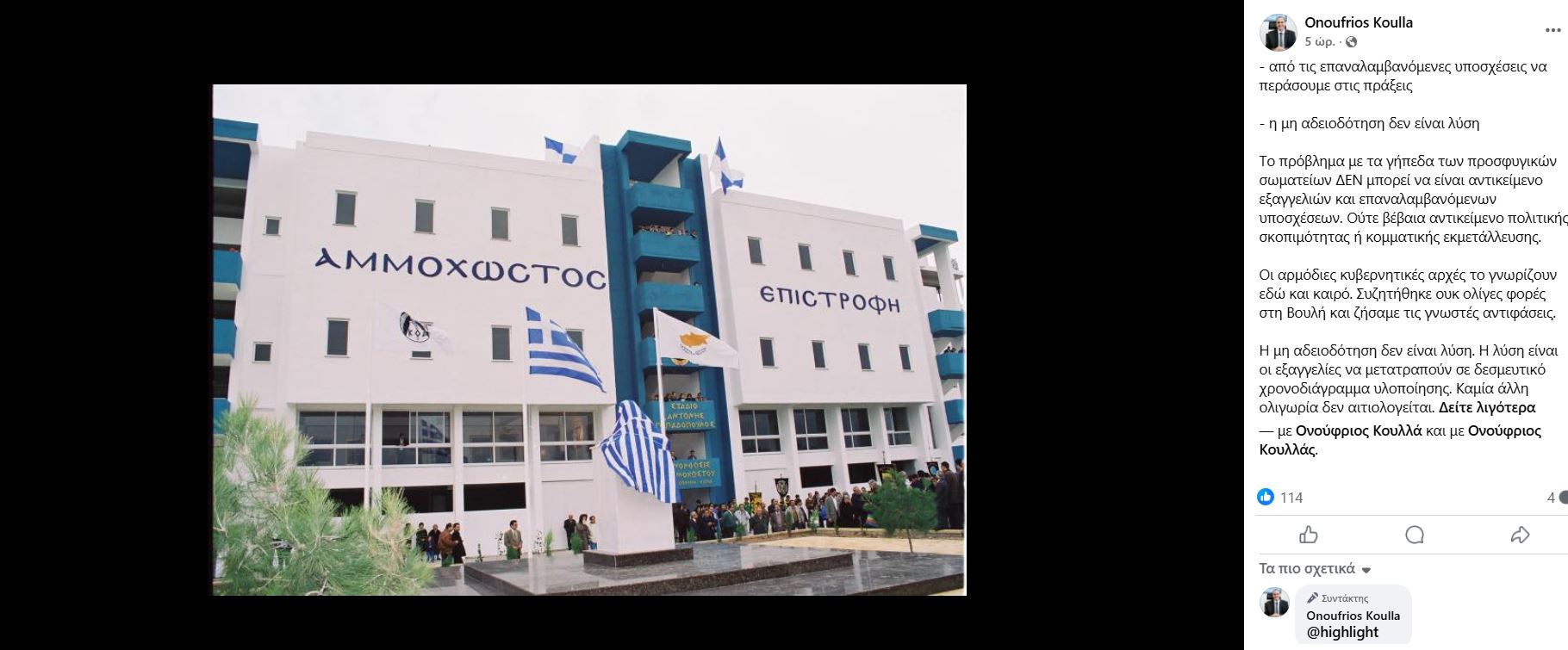 Δριμεία επίθεση εξαπολύουν εναντίον της κυβέρνησης, μέσω των μέσων κοινωνικής δικτύωσης, ο Αναπληρωτής Πρόεδρος του ΔΗΣΥ Γιάννης Καρούσος και ο Εκπρόσωπος Τύπου του κόμματος Ονούφριος Κουλλάς. Αφορμή; Οι εξαγγελίες αναφορικά με τη στήριξη των προσφυγικών σωματείων και δη της Αμμοχώστου, δηλαδή Ανόρθωσης, Σαλαμίνας και Εθνικού Άχνας.