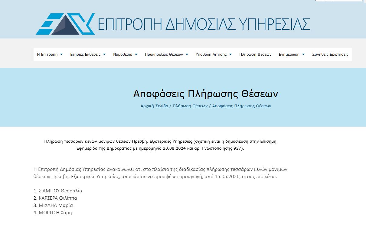 Η προαγωγή της κυρία Καρσερά-Χριστοδουλίδη και των άλλων τριών Πρέσβεων, θα τεθεί σε ισχύ από τις 15 Μαϊου 2026.