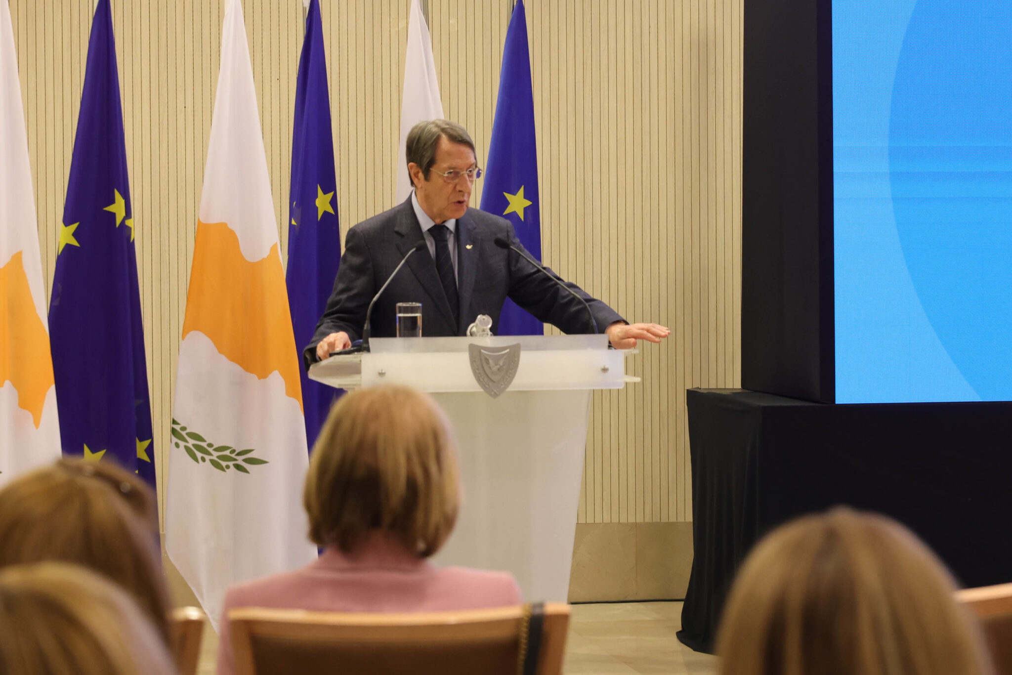 Κληθείς να πει κατά πόσο είναι ικανοποιημένη η Κυβέρνηση από το λεκτικό του προσχεδίου των εκθέσεων του ΓΓ των ΗΕ, ο Πρόεδρος είπε «χωρίς αμφιβολία όχι, αλλά μιλάμε για το προσχέδιο. Θα πρέπει να κατανοήσετε ότι καταβάλλονται διπλωματικές προσπάθειες, ώστε να υπάρξει η αναγκαία διόρθωση, ώστε τα όσα καταγράφονται στο προσχέδιο να ανταποκρίνονται στην πραγματικότητα, κάτι που αυτή τη στιγμή το προσχέδιο δεν το εκφράζει ποσώς».