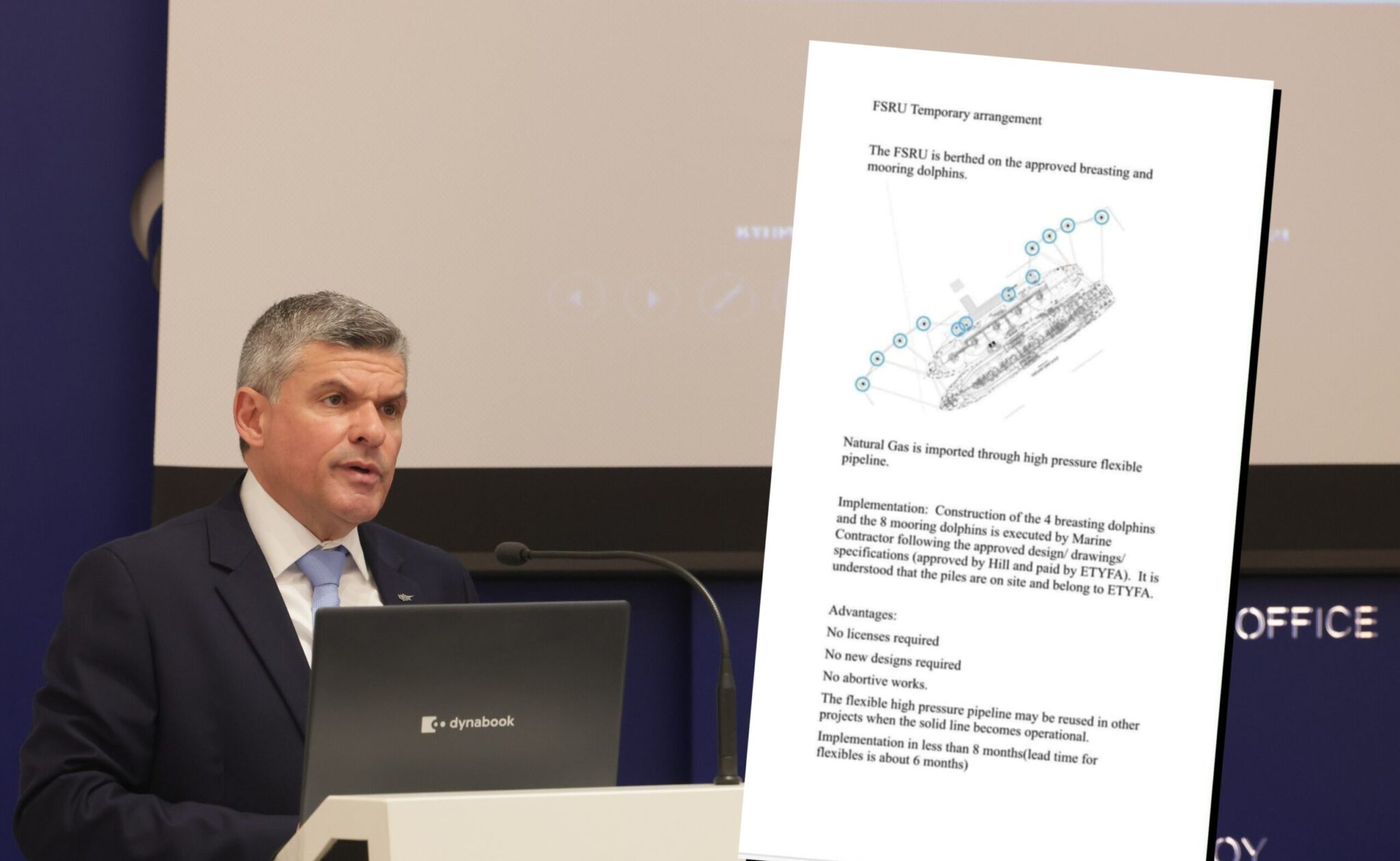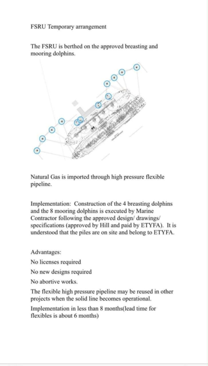Η «Αλήθεια» δημοσίευσε και έγγραφο που περιγράφει με λεπτομέρειες την «προσωρινή λύση». Προβλέπει την εγκατάσταση 4 breasting dolphins και 8 mooring dolphins – μεταλλικών πασσάλων που θα στηρίξουν την αγκυροβόληση του FSRU. Ο εύκαμπτος αγωγός υψηλής πίεσης θα συνδέει το πλοίο με την ξηρά. Σημειώνεται ότι σύμφωνα με το έγγραφο οι πάσσαλοι έχουν ήδη αγοραστεί, βρίσκονται στην Κύπρο, και οι σχεδιασμοί για την εγκατάσταση των breasting dolphinsκαι mooring dolphins έχουν ήδη εγκριθεί από τον προηγούμενο σύμβουλο την Hill International.