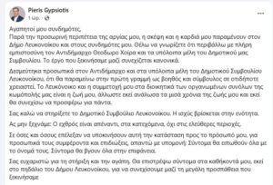 Σας ευχαριστώ για τη στήριξη και την αγάπη. Θα επιστρέψω σύντομα στα καθήκοντά μου, εκεί στο πηδάλιο του Δήμου Λευκονοίκου, για να συνεχίσουμε μαζί τη μεγάλη προσπάθεια που ξεκινήσαμε.
