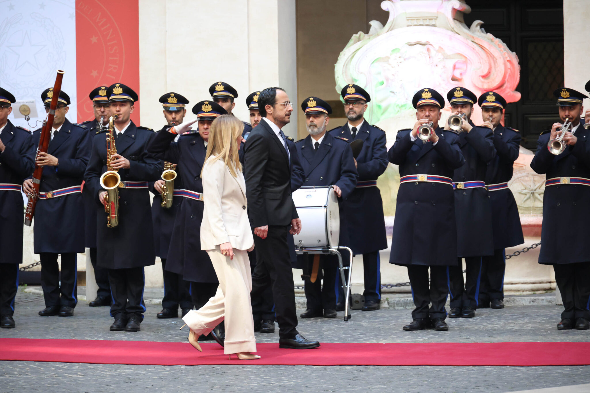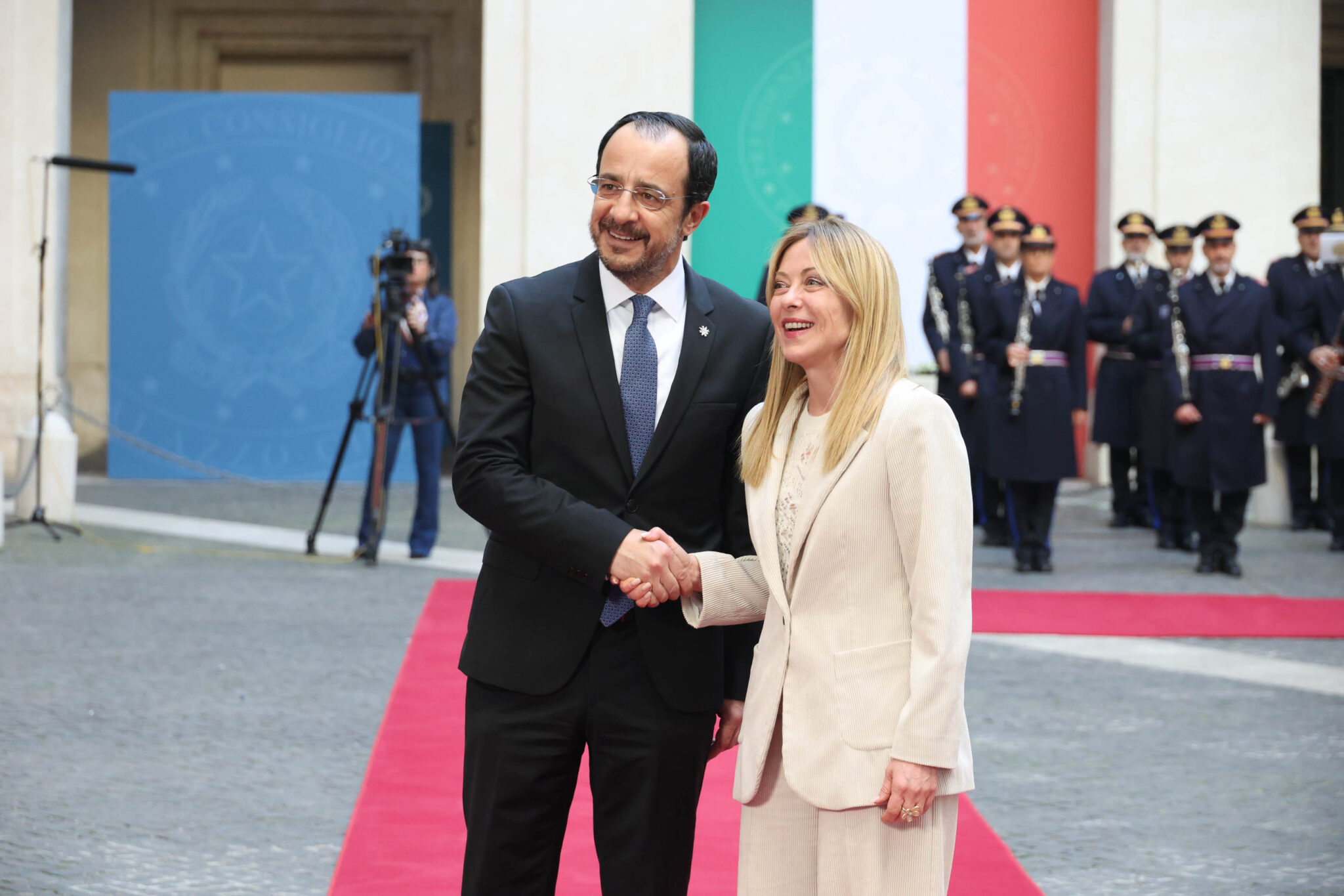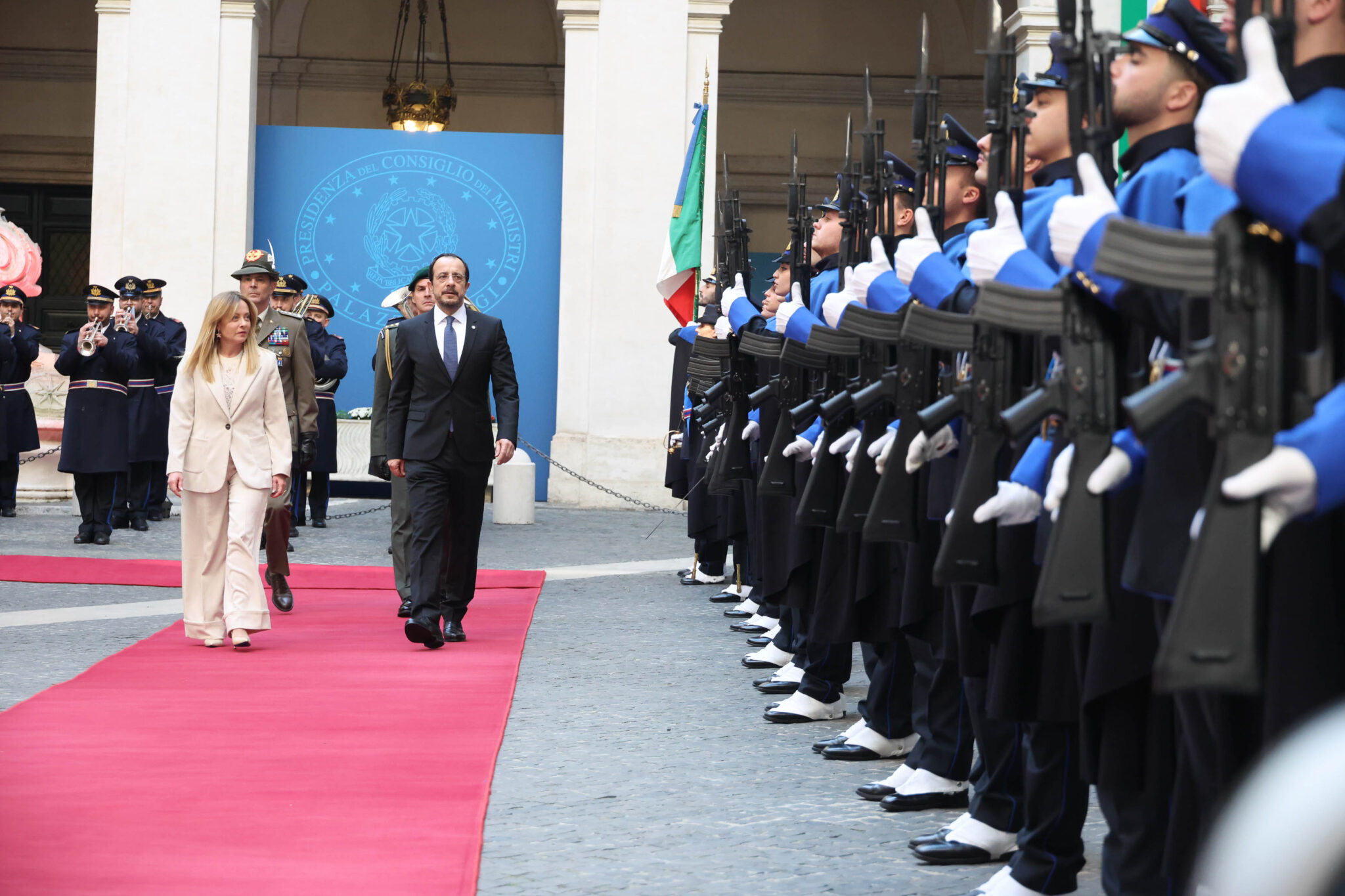 Ο Πρόεδρος της Δημοκρατίας έφθασε στο Πρωθυπουργικό Μέγαρο στις 5μμ (ώρα Κύπρου), όπου τον υποδέχθηκε η Πρωθυπουργός της Ιταλίας, ενώ στρατιωτικό άγημα απέδιδε τιμές.