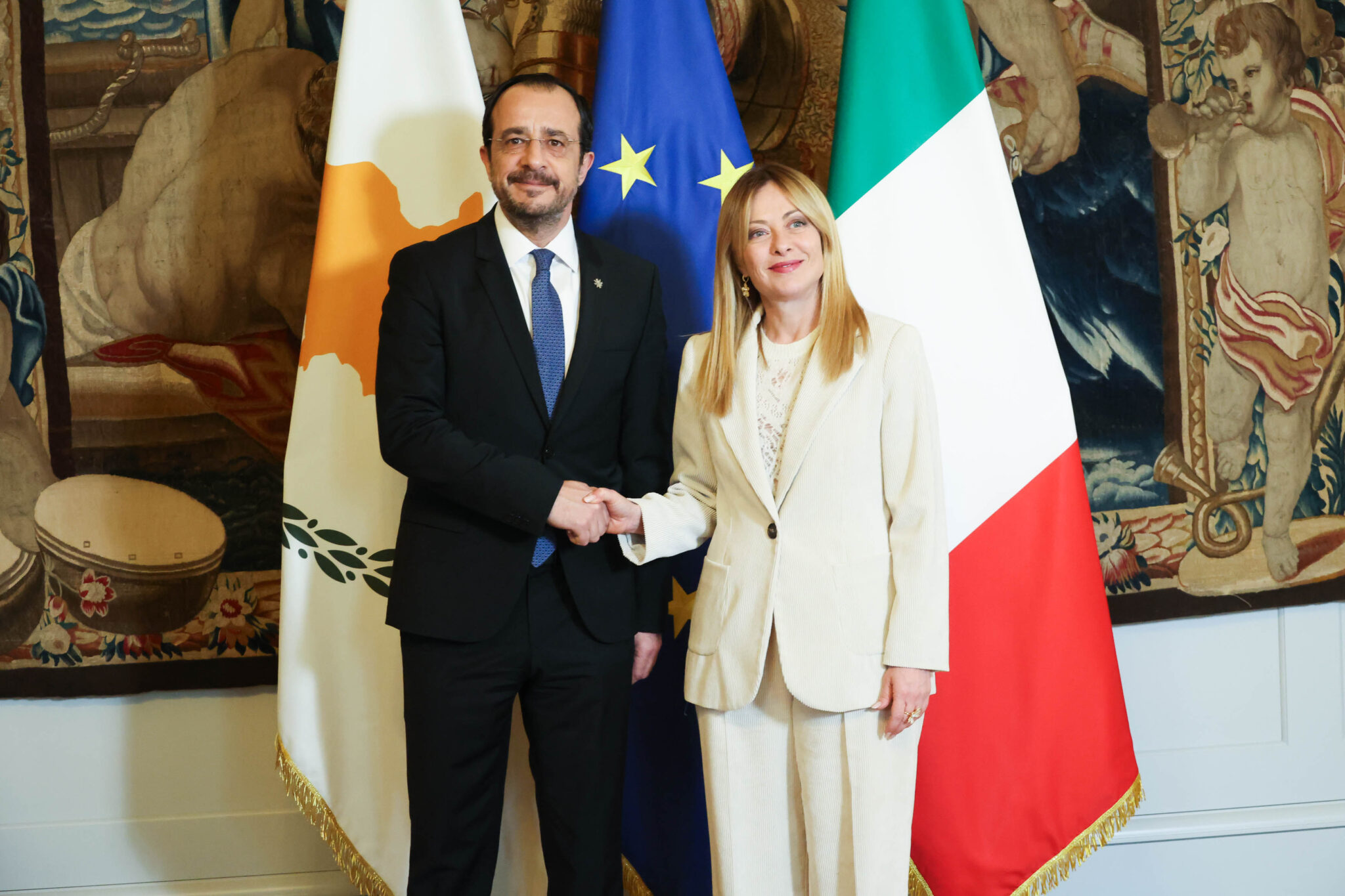 Στην ισχυρή κοινή επιθυμία των Κυβερνήσεων Κύπρου και Ιταλίας για την περαιτέρω ενίσχυση των διμερών σχέσεων ανάμεσα τους, εξέφρασαν σήμερα ο Πρόεδρος της Δημοκρατίας κ. Νίκος Χριστοδουλίδης και η Πρωθυπουργός της Ιταλίας κα Τζόρτζια Μελόνι, κατά τη συνάντηση τους στη Ρώμη, στο πλαίσιο της επίσημης επίσκεψης που πραγματοποιηθεί ο Πρόεδρος Χριστοδουλίδης στην Ιταλία