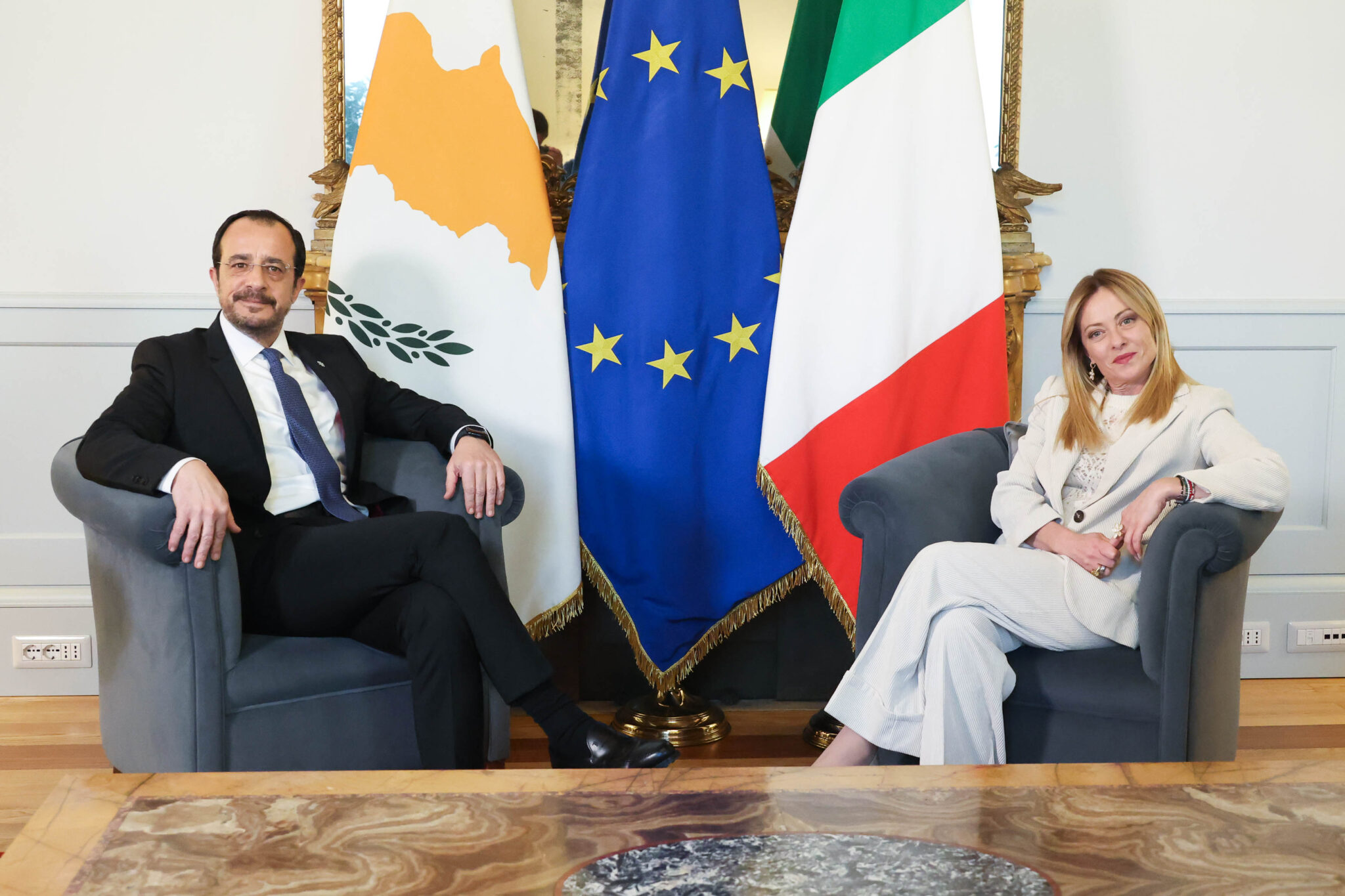 Aκολούθως οι δύο ηγέτες είχαν κατ΄ιδίαν συνάντηση και στη συνέχεια, ο Πρόεδρος Χριστοδουλίδης και η Πρωθυπουργός Μελόνι προέβησαν σε δηλώσεις στα ΜΜΕ.