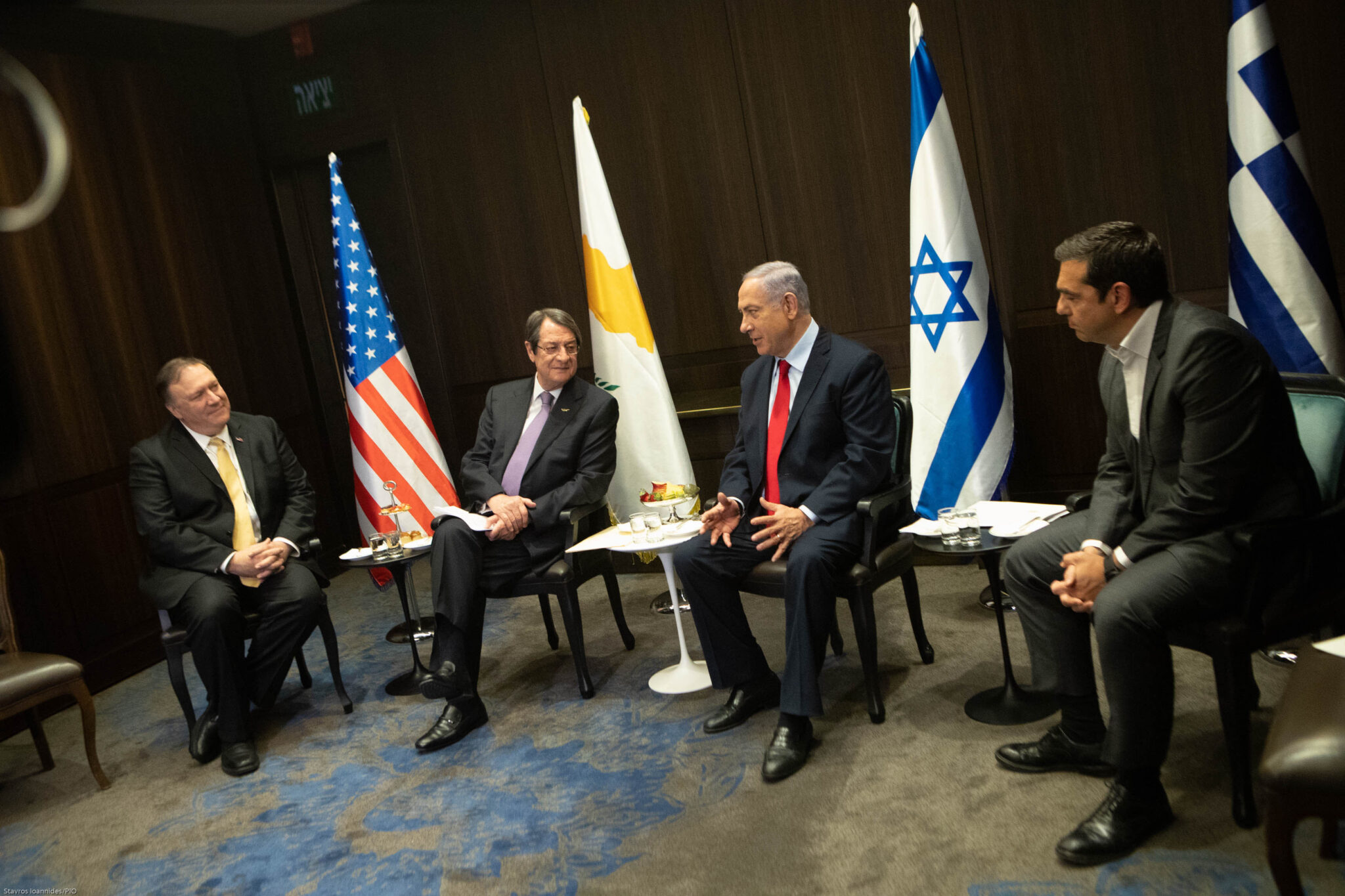 «Οι Κυβερνήσεις των Ηνωμένων Πολιτειών, το Κράτος του Ισραήλ, η Ελληνική Δημοκρατία και η Κυπριακή Δημοκρατία συναντήθηκαν σήμερα στην Ιερουσαλήμ για να επαναβεβαιώσουν την κοινή δέσμευση τους στην προώθηση της ειρήνης, της σταθερότητας, της ασφάλειας και της ευημερίας στην περιοχή της Ανατολικής Μεσογείου. Ο Υπουργός Εξωτερικών Μάικ Πομπέο υπογράμμισε την υποστήριξη των ΗΠΑ στον τριμερή μηχανισμό που εγκαθίδρυσαν Ισραήλ, Ελλάδα και Κύπρος σημειώνοντας την αυξημένη συνεργασία τους. Οι ηγέτες αποφάσισαν να διευρύνουν την περιφερειακή συνεργασία για αναβάθμιση της ενεργειακής ανεξαρτησίας τους και την ασφάλεια, να αμυνθούν ενάντια εξωτερικών κακόβουλων επιρροών στην Ανατολική Μεσόγειο και την ευρύτερη Μέση Ανατολή. Καλωσορίζουν την νέα ανακάλυψη στην Ανατολική Μεσόγειο και στη συμβολή του στην ενεργειακή ασφάλεια».
