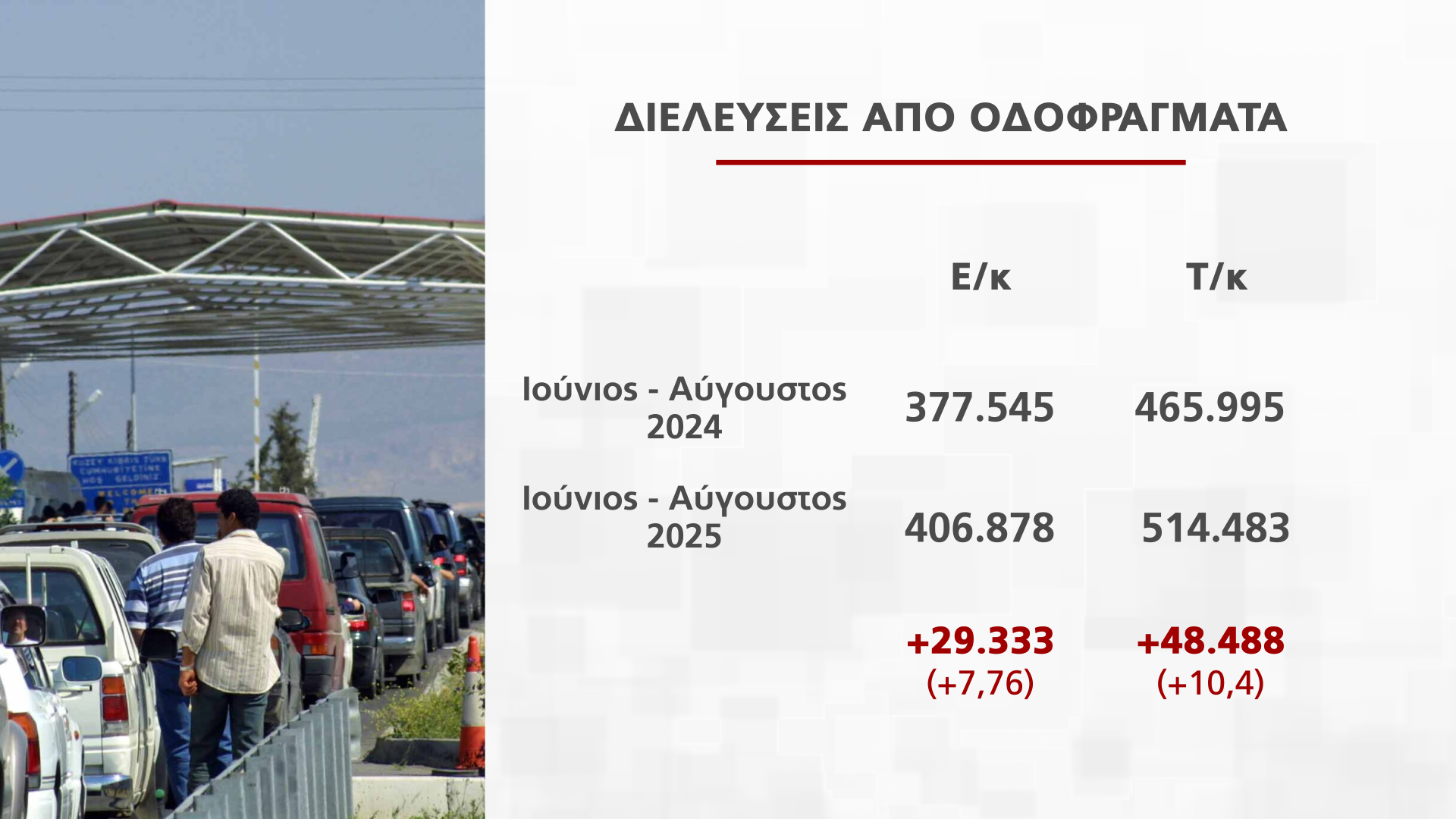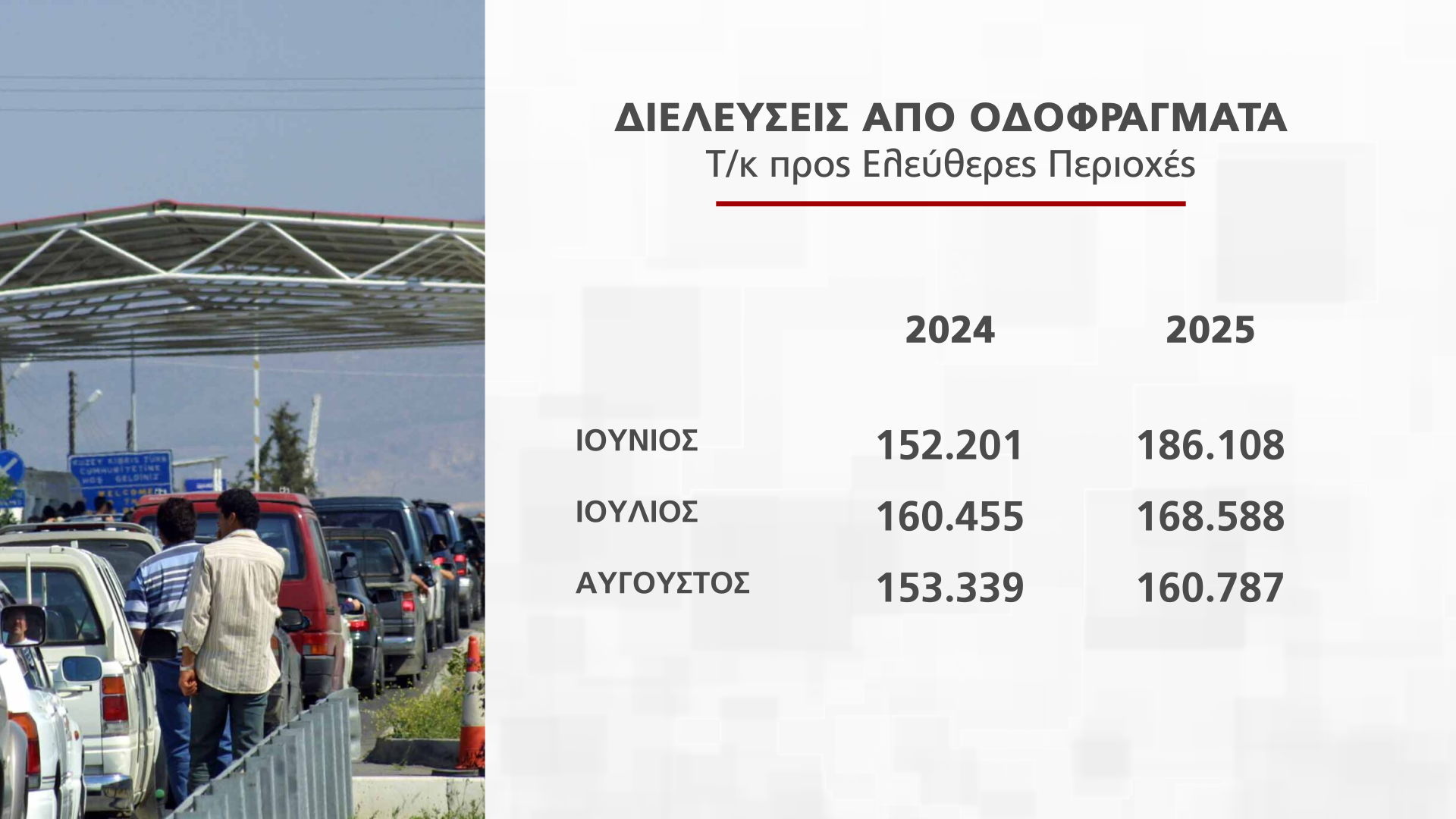 Στοιχεία που συνέλεξε και παρουσίασε στην εκπομπή Alpha Ενημέρωση ο δημοσιογράφος Ιάκωβος Ιακώβου καταδεικνύουν ότι ενώ οι διελεύσεις Ελληνοκυπρίων από τις ελεύθερες προς τις κατεχόμενες περιοχές ήταν φέτος το καλοκαίρι αυξημένες σε σχέση με το 2024, εντούτοις μειώθηκαν κατά οκτώ περίπου χιλιάδες τον Αύγουστο.