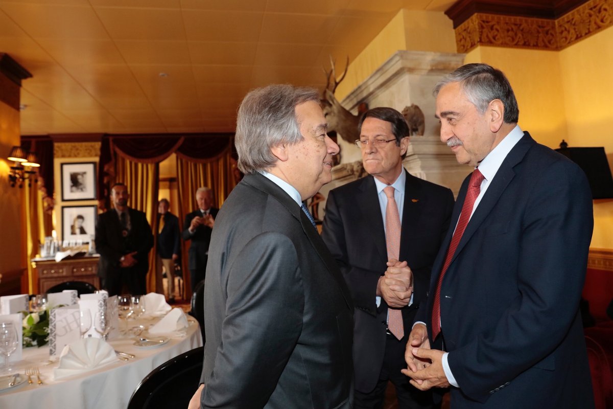 Ο ΓΓ του ΟΗΕ παρέθεσε το μεσημέρι γεύμα εργασίας στους ηγέτες των δύο κοινοτήτων, αμέσως μετά το πέρας της πρωινή συνόδου στο Κραν Μοντάνα. Πρώτος στο εστιατόριο έφτασε ο Πρόεδρος Αναστασιάδης, που είχε την ευκαιρία να έχει ολιγόλεπτο τετ-α-τετ στο… πόδι με τον Αντόνιο Γκουτέρες.Σ’ αυτήν ακριβώς τη φάση τους πέτυχε ο Μουσταφά Ακιντζί λέγοντάς τους να μην κουτσομπολεύουν.