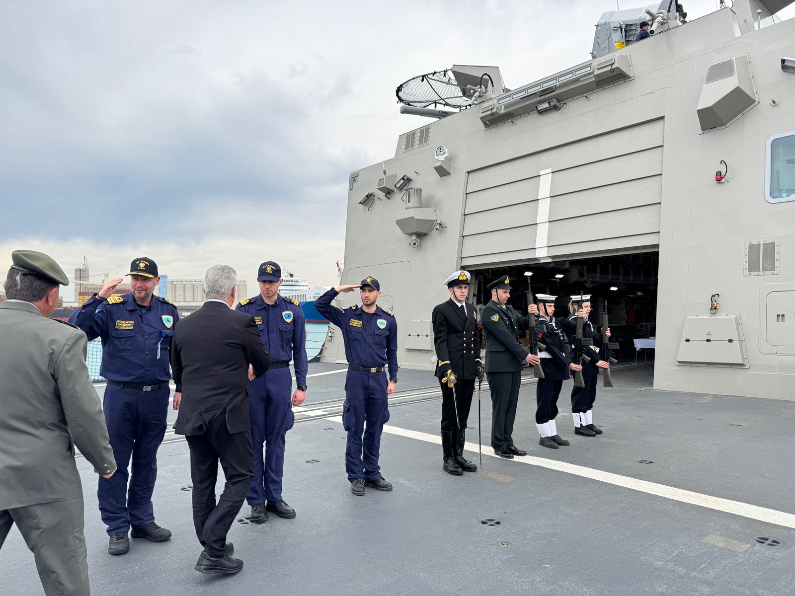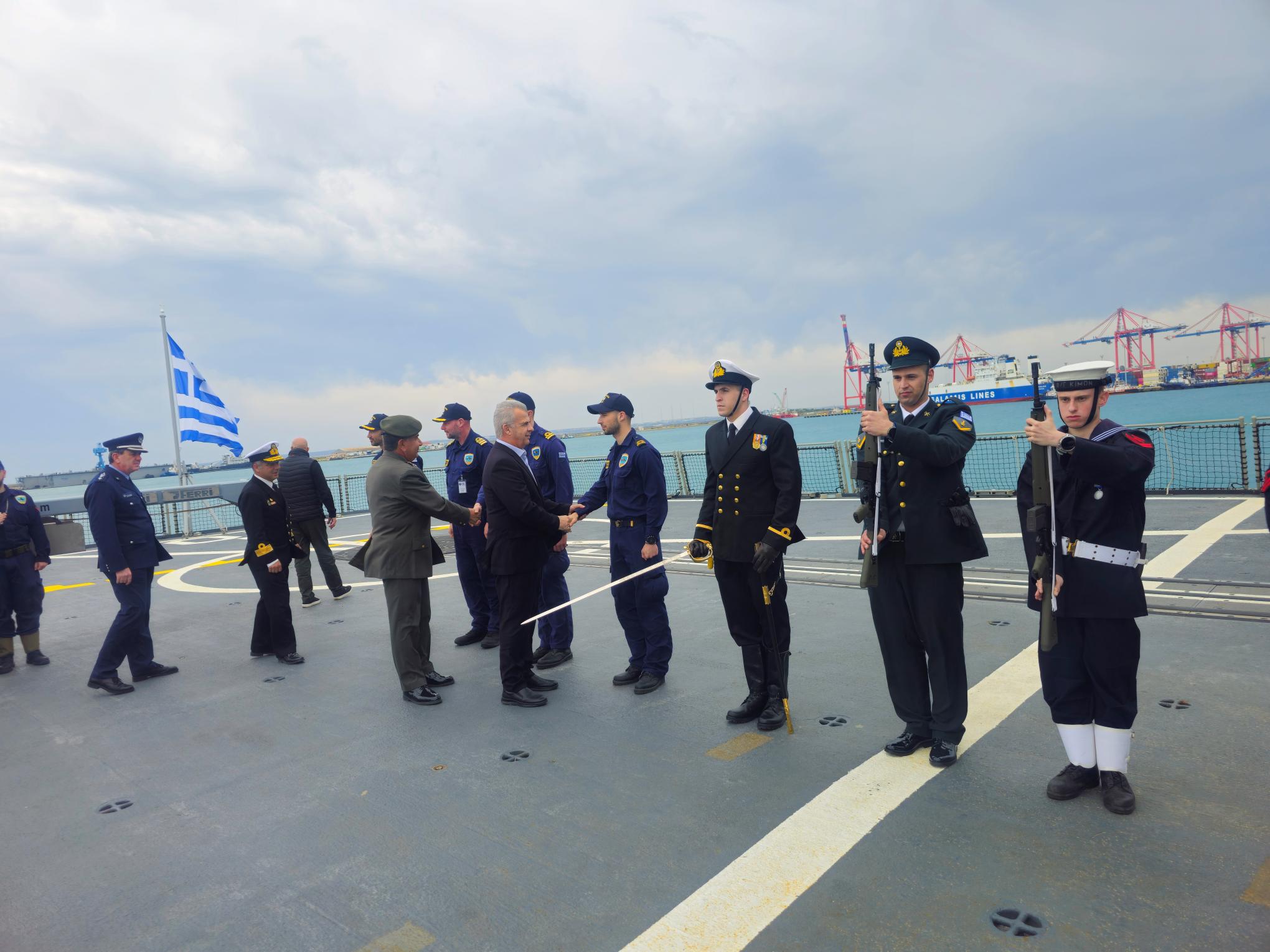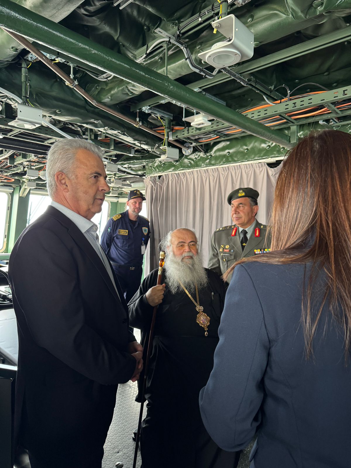 Τη φρεγάτα του Ελληνικού Πολεμικού Ναυτικού «Κίμων», που αγκυροβόλησε στο λιμάνι Λεμεσού, επισκέφτηκαν σήμερα ο Υπουργός Δικαιοσύνης Κωνσταντίνος Φυτιρής, η Υφυπουργός Ναυτιλίας Μαρίνα Χατζημανώλη και ο Αρχιεπίσκοπος Κύπρου Γεώργιος.