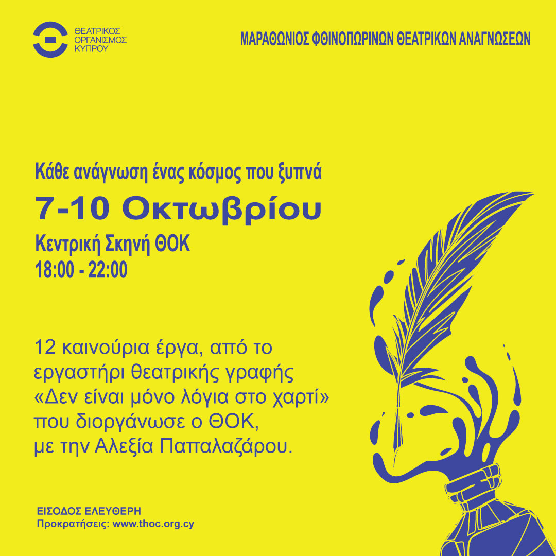 Ο Μαραθώνιος Φθινοπωρινών Θεατρικών Αναγνώσεων είναι μια εξαιρετική ευκαιρία να γνωρίσει το κοινό από κοντά τις νέες φωνές στη θεατρική γραφή, να ακουστούν τα έργα τους να ζωντανεύουν επί σκηνής και να διευρυνθεί ο διάλογος για το σύγχρονο θέατρο.