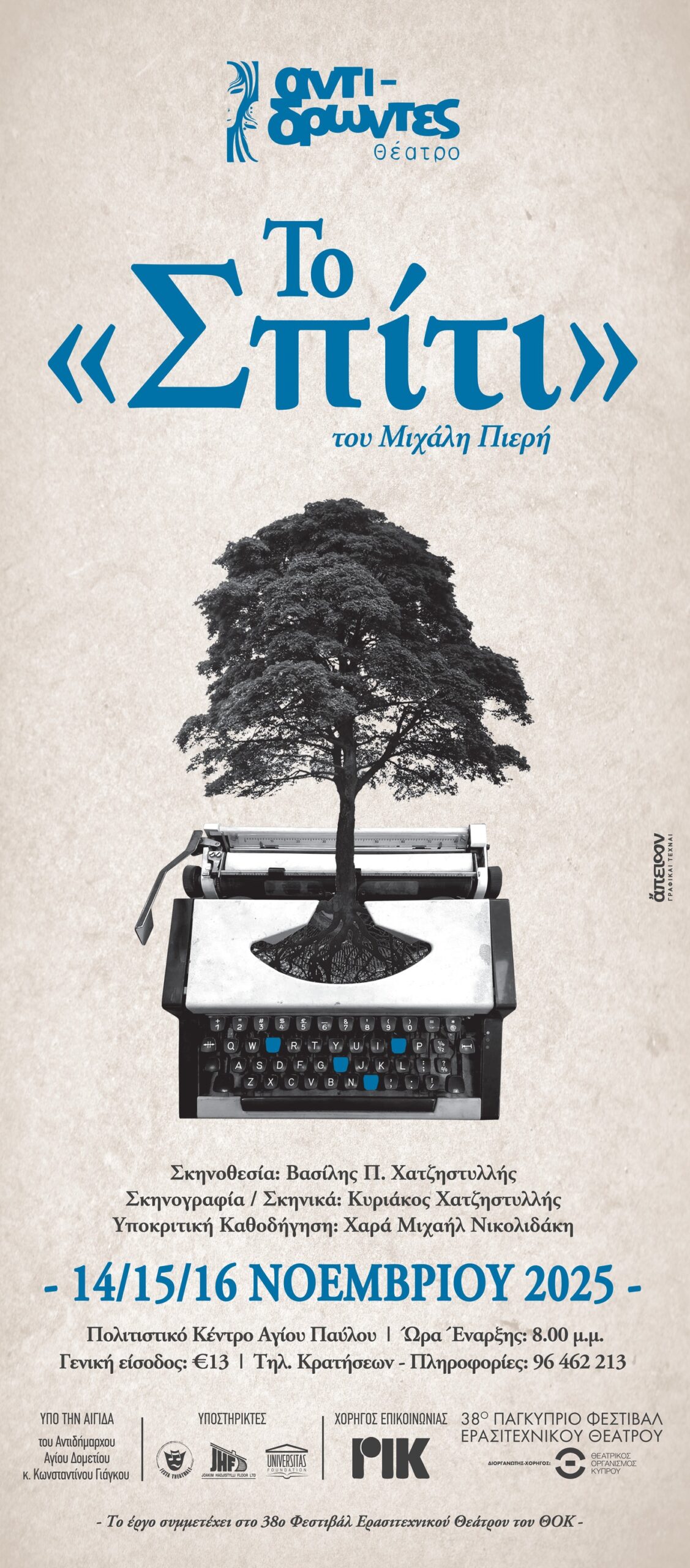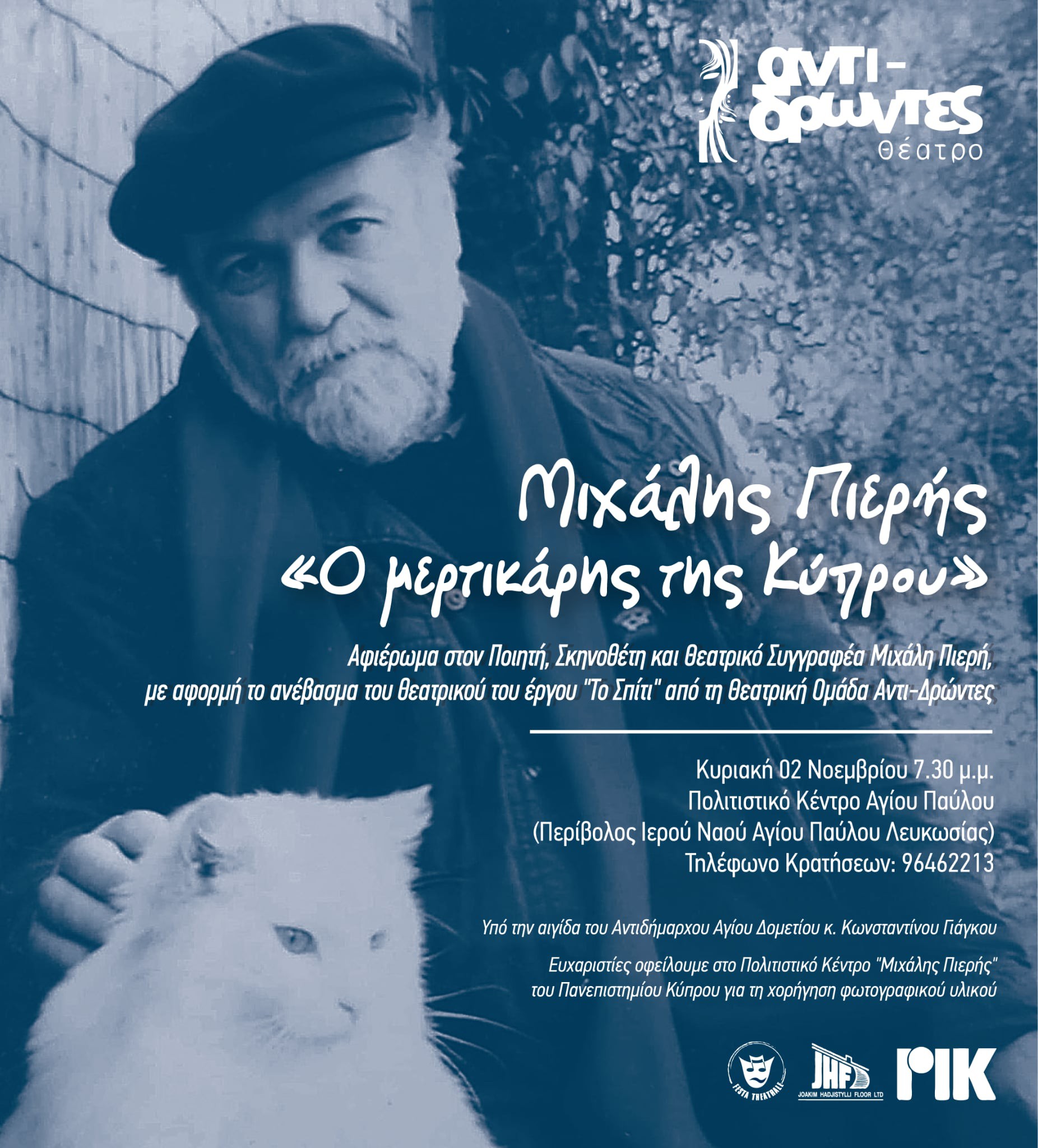 Με αφορμή το ανέβασμα του θεατρικού έργου Το Σπίτι από τη Θεατρική Ομάδα «Αντι-Δρώντες», διοργανώνεται τιμητική εκδήλωση αφιερωμένη στον ποιητή, σκηνοθέτη και θεατρικό συγγραφέα Μιχάλη Πιερή. Στο πλαίσιο του αφιερώματος, συνεργάτες, φοιτητές και φίλοι του Μιχάλη Πιερή θα αναδείξουν τη συνολική και πολυεπίπεδη καλλιτεχνική του δημιουργία, η οποία εκτείνεται από την ποίηση και τη δραματουργία έως τη σκηνοθεσία και τη σημαντική του παρουσία στο πανεπιστημιακό και πολιτιστικό γίγνεσθαι της Κύπρου. Ο Βασίλης Χατζηστυλλής θα παρουσιάσει τη σκηνοθετική του προσέγγιση στο έργο Το Σπίτι, το οποίο κάνει πρεμιέρα στις 14 Νοεμβρίου 2025, στο πλαίσιο του 38ου Φεστιβάλ Ερασιτεχνικού Θεάτρου του ΘΟΚ.
