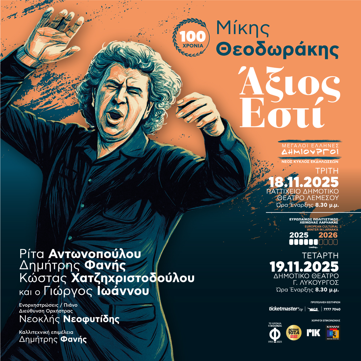 Μετά από τρεις παραστάσεις που γνώρισαν θερμή ανταπόκριση και συγκίνησαν το κοινό σε όλη την Κύπρο, το σπουδαίο μουσικό αφιέρωμα «Άξιος Εστί» του Δημήτρη Φανή επιστρέφει για δύο ακόμα μοναδικές συναυλίες, αφιερωμένες στον ανεπανάληπτο Μίκη Θεοδωράκη.