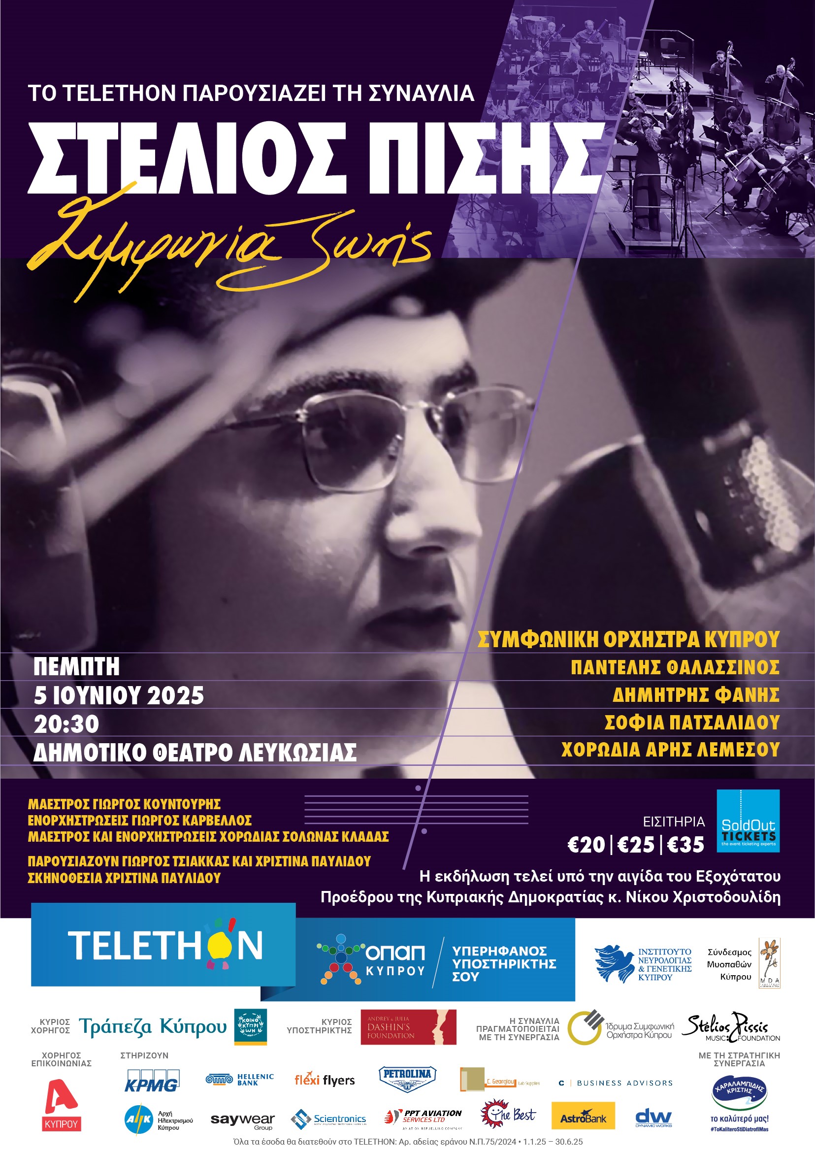 Την Πέμπτη 5 Ιουνίου 2025, το TELETHON Κύπρου τιμά τη μνήμη και το έργο του αείμνηστου Στέλιου Πισή, με μια ξεχωριστή συναυλία στο Δημοτικό Θέατρο Λευκωσίας, υπό τον τίτλο «Στέλιος Πισής – Συμφωνία Ζωής». Η εκδήλωση τελεί υπό την αιγίδα του Εξοχότατου Προέδρου της Κυπριακής Δημοκρατίας, κ. Νίκου Χριστοδουλίδη, και πραγματοποιείται σε συνεργασία με το Ίδρυμα Συμφωνικής Ορχήστρας Κύπρου και το Stelios Pissis Music Foundation.