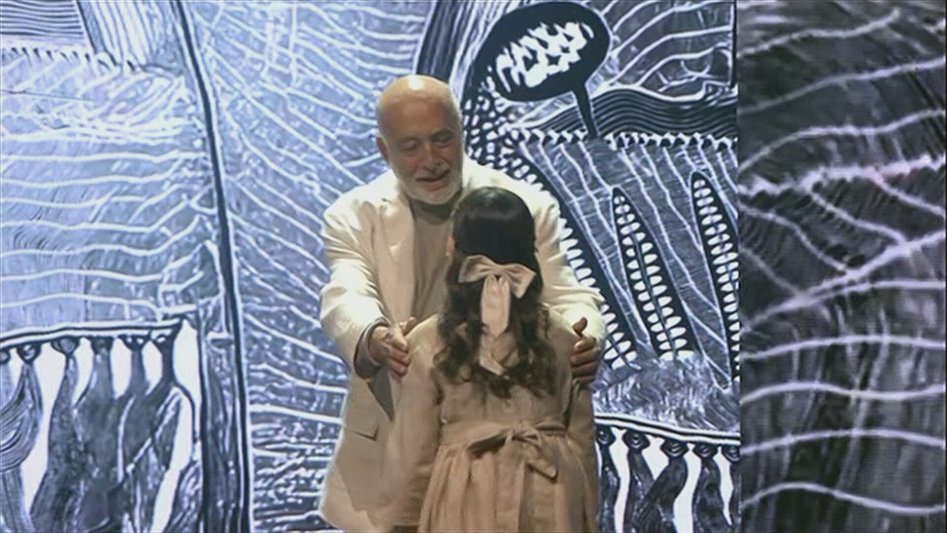 Επί σκηνής ο Χαμπής Τσαγκάρης και το εμβληματικό χαρακτικό του με την Κύπρο σχηματισμένη από λευκά περιστέρια.