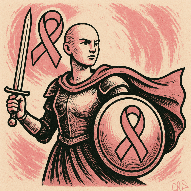 Ο Χρίστος Κακουλλής παρουσιάζει τη νεαρή μαχήτρια, φορώντας πανοπλία, να κρατά ένα σπαθί και να έχει στην ασπίδα της τη ροζ κορδέλα.