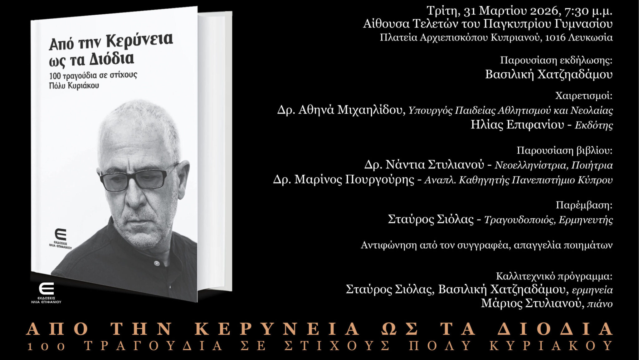 Οι Εκδόσεις Ηλία Επιφανίου και ο Ποιητής Πόλυς Κυριάκου σας προσκαλούν στην παρουσίαση του βιβλίου «ΑΠΟ ΤΗΝ ΚΕΡΥΝΕΙΑ ΩΣ ΤΑ ΔΙΟΔΙΑ 100 ΤΡΑΓΟΥΔΙΑ ΣΕ ΣΤΙΧΟΥΣ ΠΟΛΥ ΚΥΡΙΑΚΟΥ».