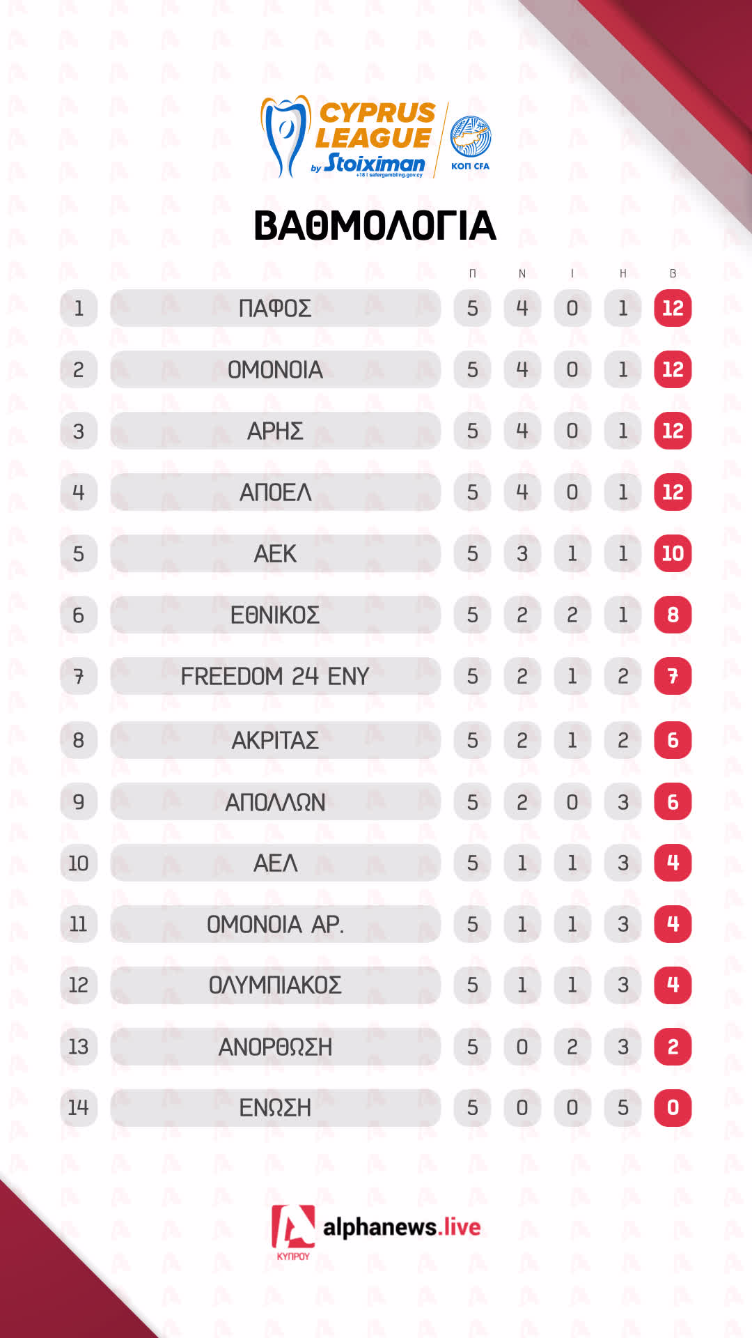 Ολοκληρώθηκε το βράδυ της Κυριακής (28/9) η 5η αγωνιστική της Cyprus League by Stoiximan. Η δράση άρχισε την Παρασκευή και ολοκληρώθηκε ψες, χωρίς… ιδιαίτερες διαφοροποιήσεις.