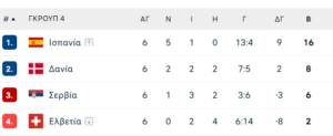 Στο 4ο γκρουπ, η Δανία κατάφερε να πάρει το 0-0 στη Σερβία και να εξασφαλίσει τη δεύτερη θέση και την πρόκριση στα προημιτελικά, με τους γηπεδούχους να τερματίζουν τρίτοι και να δύναται να αντιμετωπίσουν την Ελλάδα στα playoffs, με έπαθλο μια θέση στα… σαλόνια.