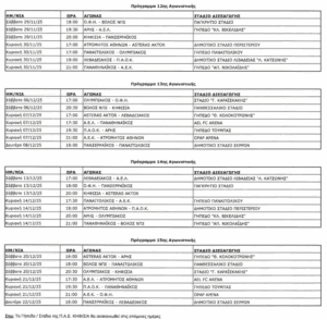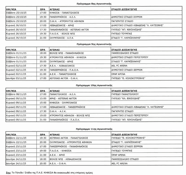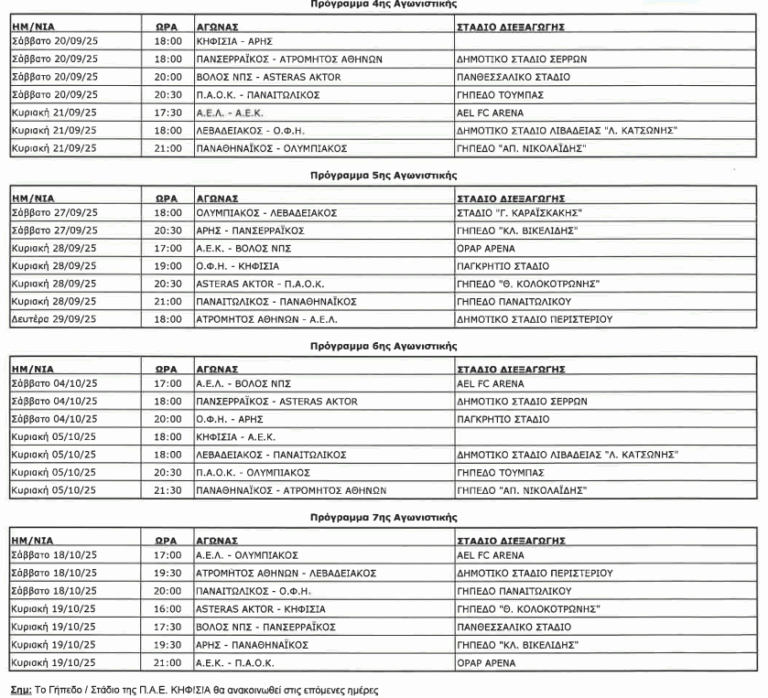 Η Stoiximan Super League δημοσίευσε το αναλυτικό πρόγραμμα των αγωνιστικών από την 4η έως και τη 15η, καλύπτοντας ουσιαστικά όλο το υπόλοιπο του 2025.