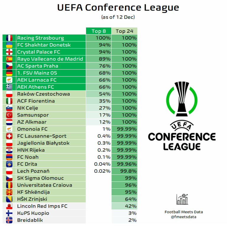 Συγκεκριμένα, σύμφωνα με το «Football Meets Data» η ΑΕΚ μετά την ισοπαλία στη Σουηδία εξασφάλισε 100% την παρουσία της στη φάση των play-off, ενώ έχει 66% πιθανότητα να βρεθεί απευθείας στη φάση των «16».