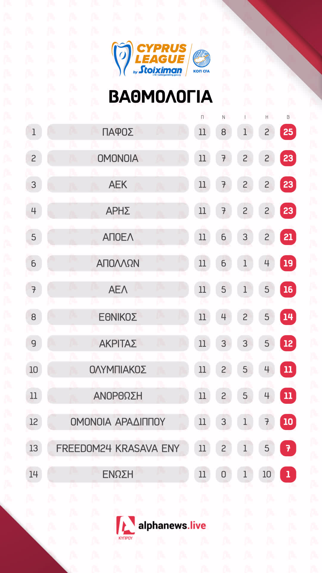 Ολοκληρώθηκε το βράδυ της Δευτέρας (24/11) η δράση για την 11η αγωνιστική της Cyprus League by Stoiximan, το τέλος της οποίας βρίσκει διαφορετικό… ένοικο στο ρετιρέ.