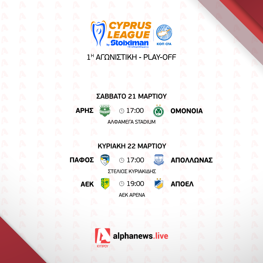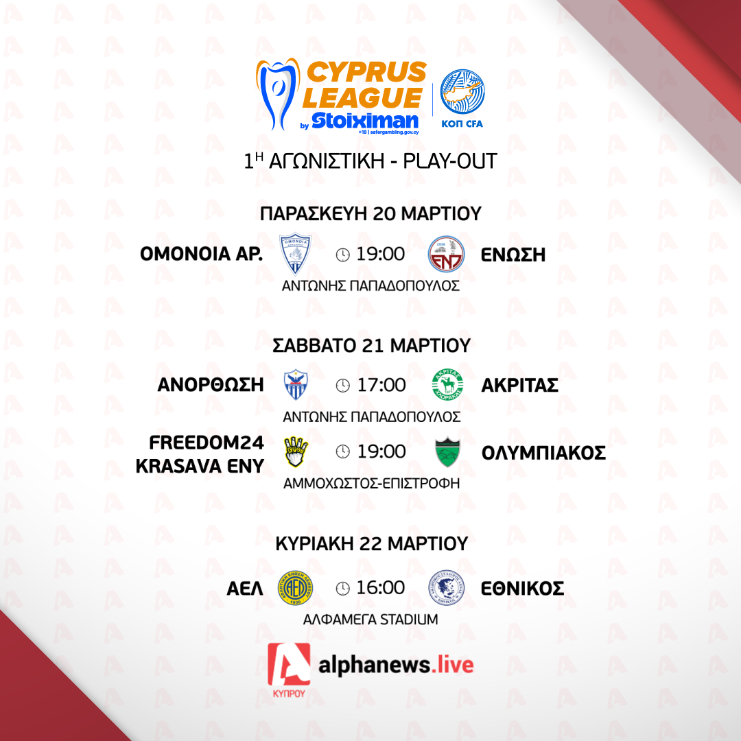 Την Κυριακή (22/3) στις 16:00, στο «Άλφαμεγα Stadium», ΑΕΛ και Εθνικός ρίχνουν την αυλαία της πρεμιέρας των play-out, για να πάρουν τη σκυτάλη δύο σπουδαία παιχνίδια του πρώτου γκρουπ. Στις 17:00, η Πάφος υποδέχεται τον Απόλλωνα στο «Στέλιος Κυριακίδης» και στις 19:00, ΑΕΚ και ΑΠΟΕΛ κοντράρονται στην «Αρένα».